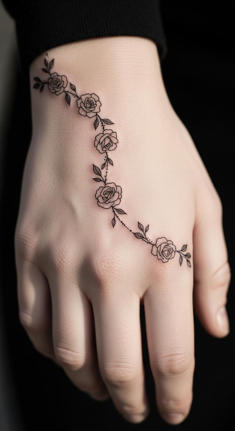 A fine-line rose chain on the hand links elegance. Thin lines make it delicate. Budget $60 easy. String lines with thread. Choose for hand visibility. Details last with care. Look for quick deals. Add links for continuity. Heal fast. DIY with fine pens. This design fits daily life. Get it swiftly. Show for approval. Make it connected style.