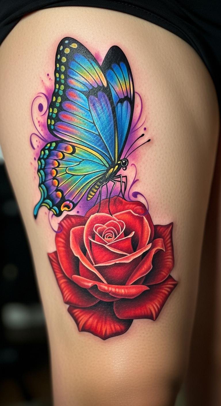 A vibrant butterfly rose on the thigh wings into fantasy. Colors pop with life. Aim for $200 detailed. Draw butterflies together. Put it for private joy. Blends stay bright. Find collaborative artists. Include wings fully. Care with lotions. Try fabric designs. This design flows with body. Break into sessions. Share creations. Make it dynamic.
