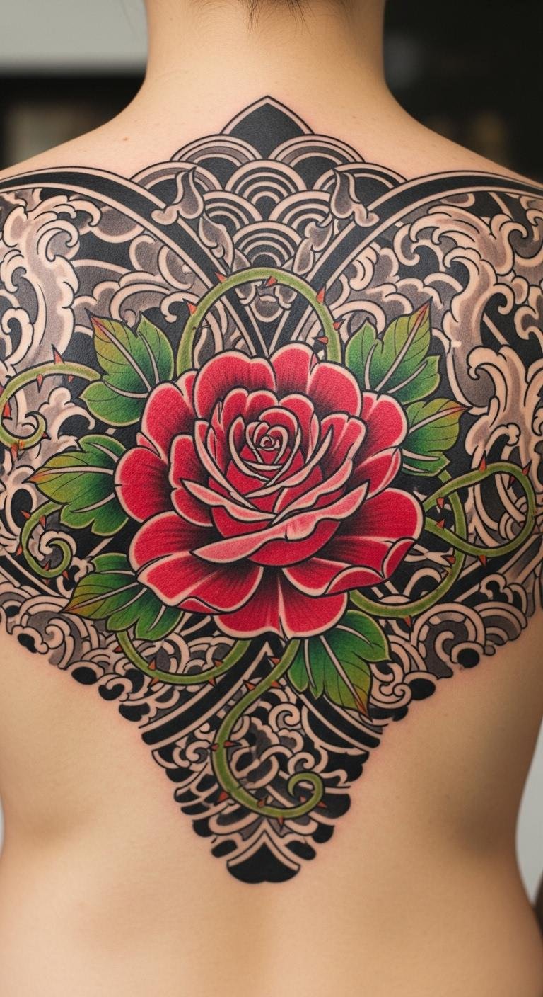 An Irezumi-inspired rose on the upper back draws from heritage. Bold lines tell tales. Budget $300 for tradition. Trace patterns carefully. Place for full back story. Designs hold tradition. Look for cultural experts. Add waves if desired. Heal traditionally. Practice with brushes. This spot covers large areas. Plan multiple visits. Discuss heritage. Make it cultural art.