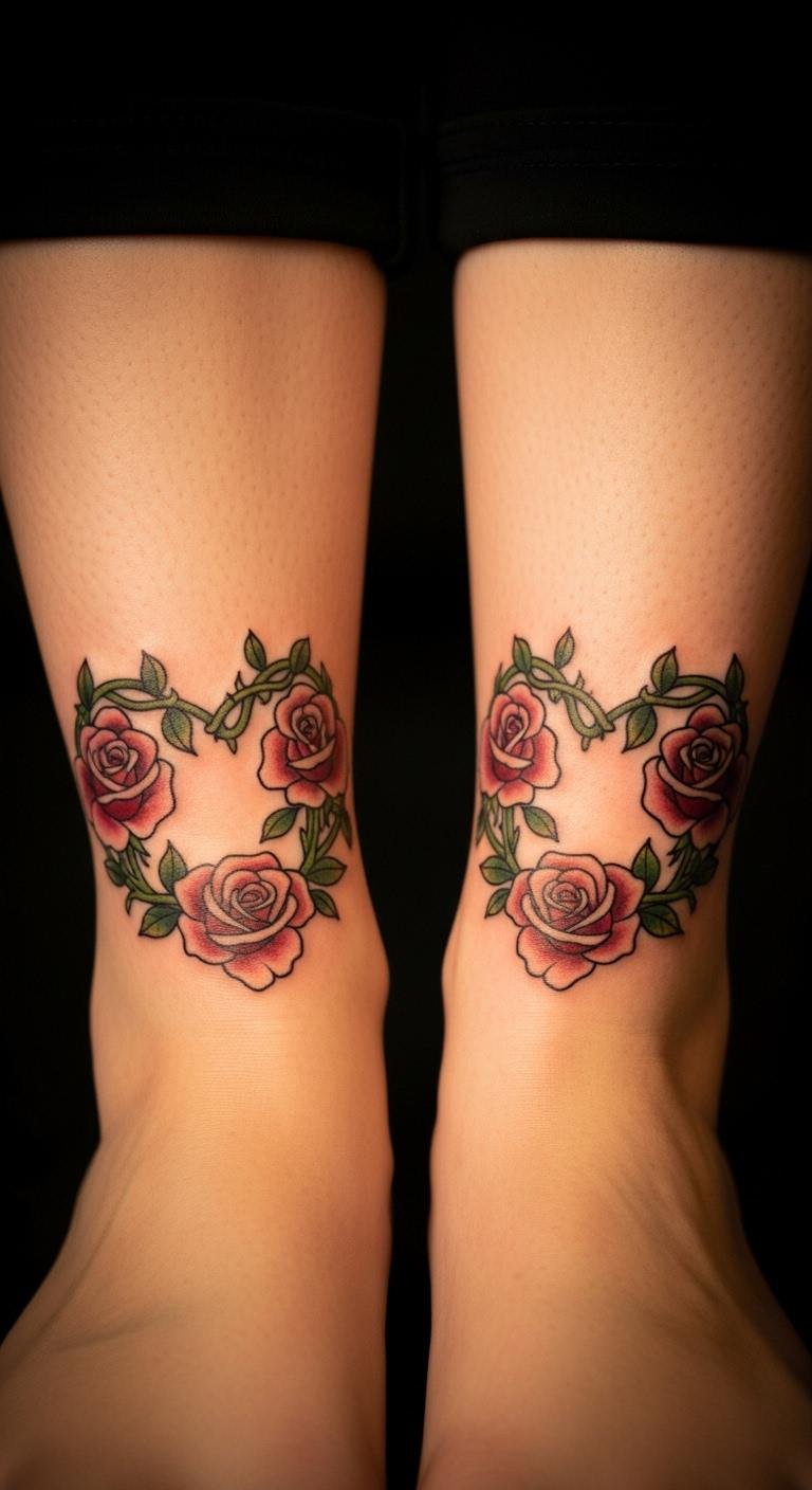 Paired rose hearts on the ankles match for couples. Hearts link the roses. Cost $160 for both. Sketch pairs together. Place for symmetry. Designs bond well. Find duo deals. Add hearts boldly. Heal as a pair. DIY with couple sketches. This spot shares love. Do it together. Show as a team. Make it matching.