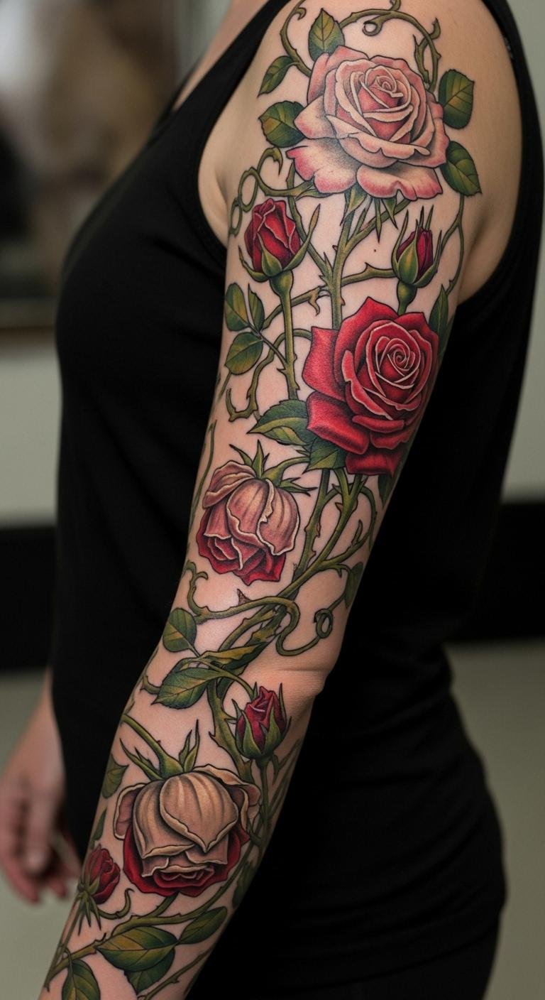 A full-sleeve rose garden covers with beauty. Roses and vines create a scene. Budget $500 big. Plan sketches in parts. Place for arm display. Elements flow together. Find sleeve specialists. Add variety for interest. Care step by step. Try arm wraps for ideas. This design tells a story. Build over time. Discuss progress. Make it garden epic.