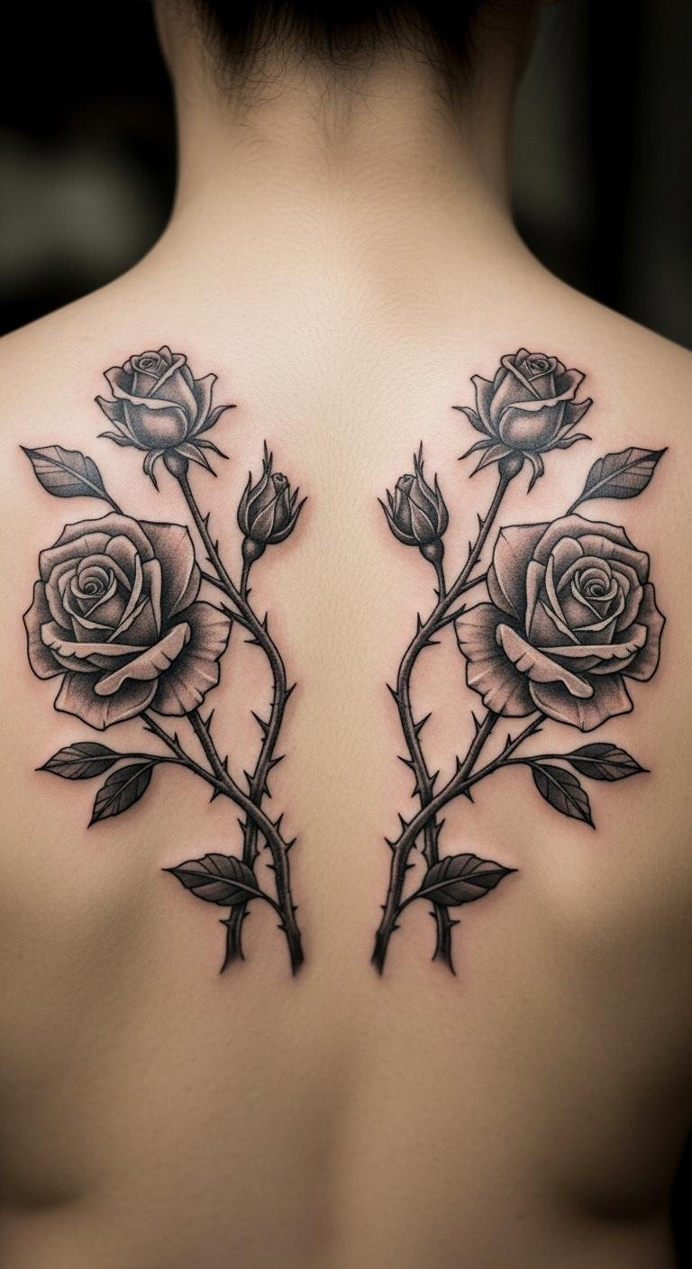 A realistic thorned rose on the back brings nature alive. Details make it pop like real. Budget $250 for the work. Sketch from photos on paper. Place it for a bold cover. Shading enhances the effect. Seek out specialists in your area. Include leaves for fullness. Use cheap lotions for maintenance. Practice with photo edits. This spot allows for larger pieces. Break sessions into parts. Gather feedback from others. Make it a personal masterpiece.
