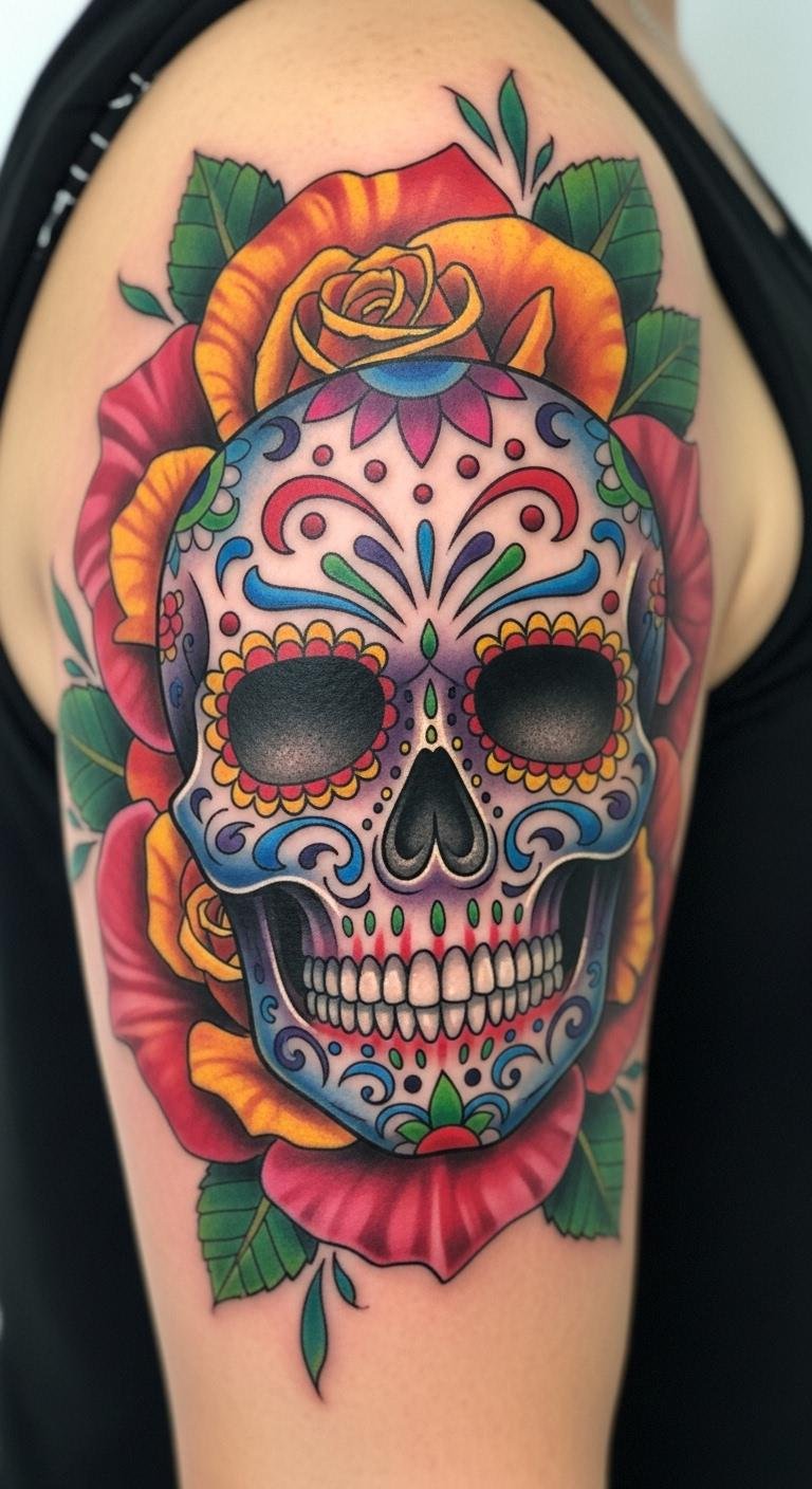 A sugar skull rose on the upper arm mixes fun and festivity. Colors brighten the whole look. Try for $180 with color. Draw inspirations from crafts. Put it where sleeves hide it. Blends stay vivid with touch-ups. Find group session discounts. Add patterns for more pop. Care with everyday products. DIY with face paints first. This design shines in photos. Schedule around your time. Share for community input. Make it a lively choice.