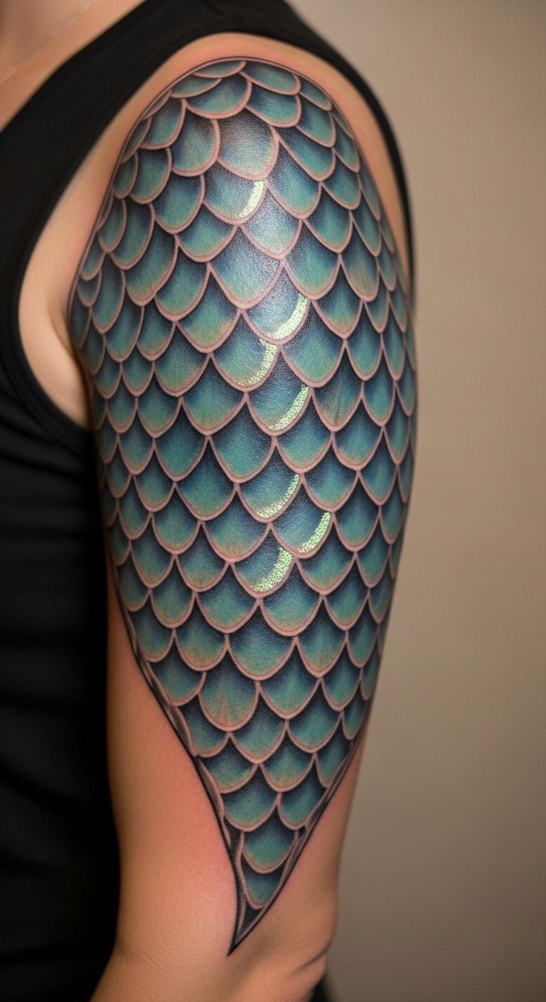 A fish scale tattoo reflects underwater life and protection. Plan with a sketch. Use cheap transfers. Place it on your arm for cover. Find affordable artists. Add colors with free edits. Size to 2 inches. This design scales up stories. Get tips on deals. It’s a layered choice.