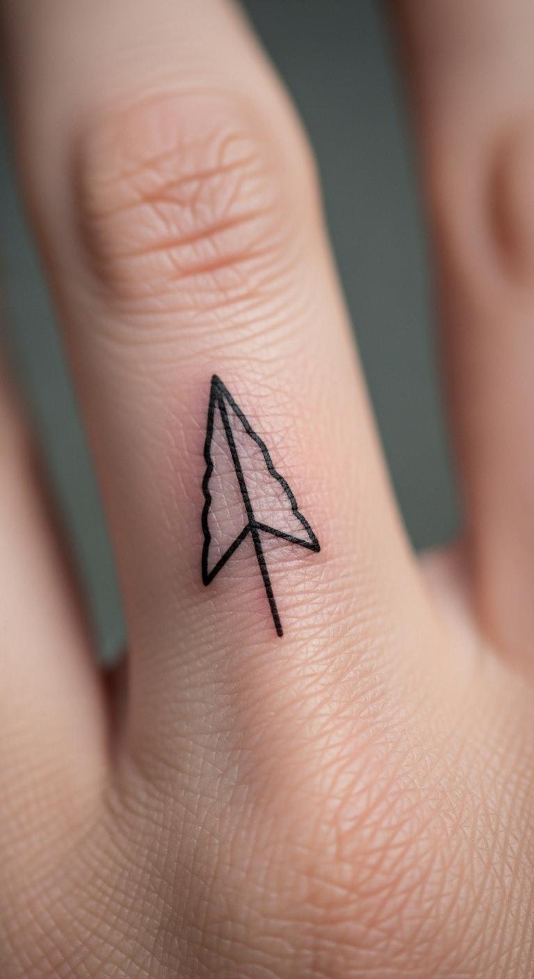 An arrowhead tattoo points to direction and progress. Draw it small. Use cheap temporaries. Put it on your finger forward. Find quick artists. Add feathers with apps. Size to 1 inch. This tattoo heads journeys. Get suggestions. It’s a pointed pick.