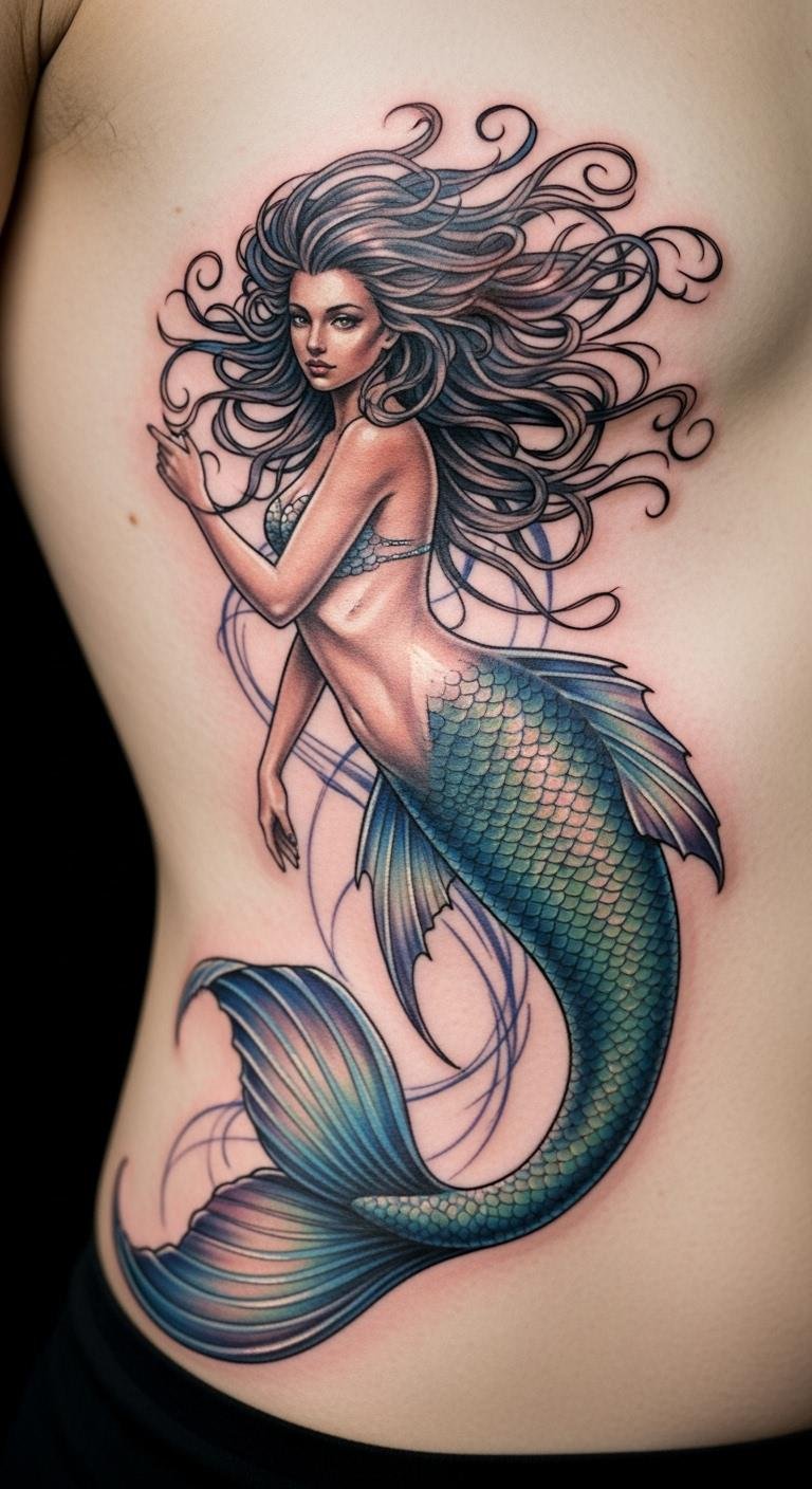 A mermaid tattoo brings mystery and allure from the deep. It’s a nod to seafaring tales. Sketch one quickly on your side with a pen. Try a washable sticker kit for under $3 to preview it. Situate it on your hip for a personal touch. Find artists who keep things simple to save cash. Incorporate tails with free online templates for customization. Choose 3 inches for an economical choice. This design evokes ocean myths and personal escapes. Seek tips from friends on budget spots. All in all, it’s a fun, affordable myth to wear.