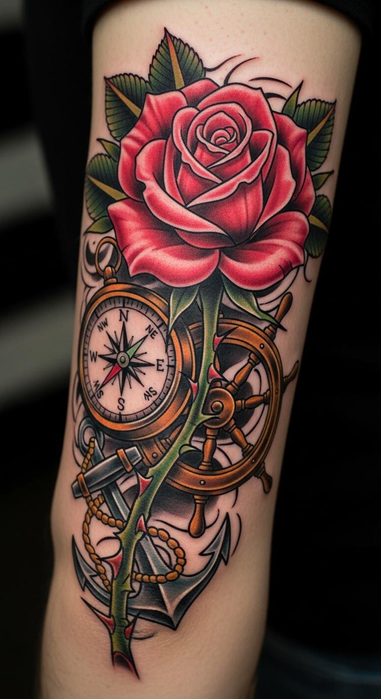 A rose tattoo adds a touch of beauty amid sailor themes, symbolizing love and resilience. Start with a simple drawing. Buy washable tattoos online for pennies. Position it on your elbow for flair. Find artists who mix styles affordably. Customize stems with free software. Aim for 2 inches in size. This design blooms with personal stories. Ask friends for thrifty suggestions. In short, it’s a lovely, budget-friendly bloom.