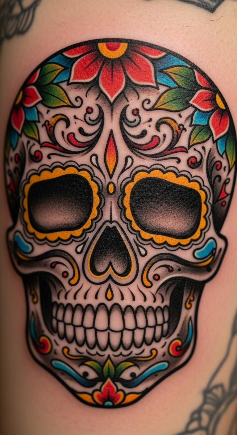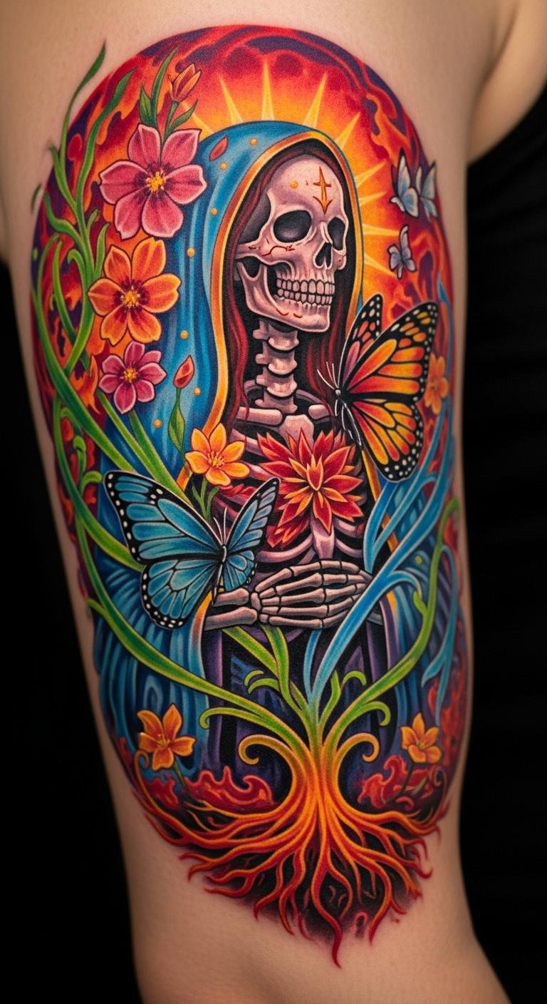 Draw from Day of the Dead for vibrant Santa Muerte tattoos that honor celebrations. Place it on your forearm for festive vibes. It captures joy in remembrance. Create a DIY version with craft paper and paints. Outline a skull with bright colors. For low-budget fun, use face paints for temporary tests. Visit a community artist for cost-effective designs. Incorporate personal colors for a twist. This approach makes tattooing accessible and fun.