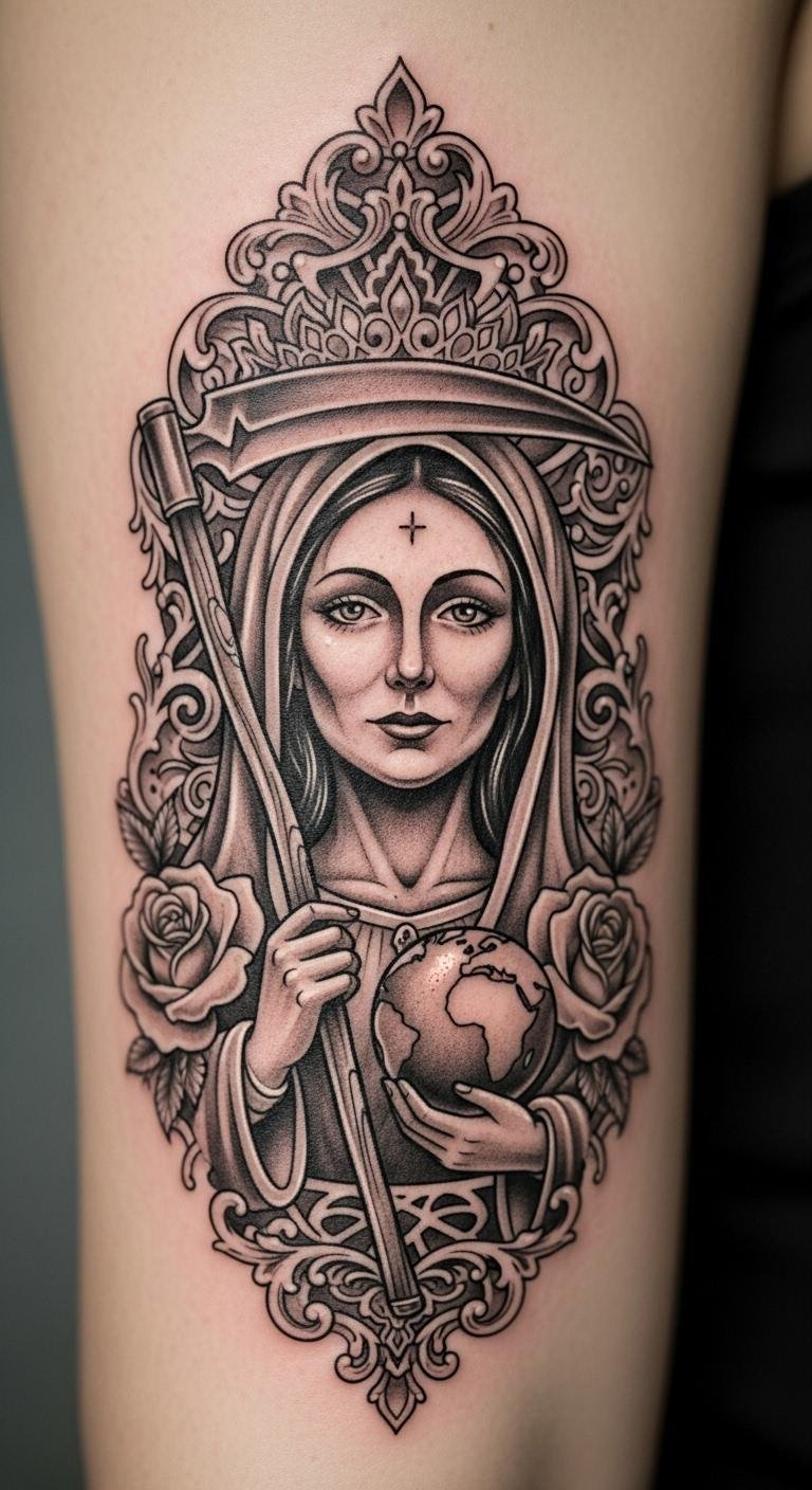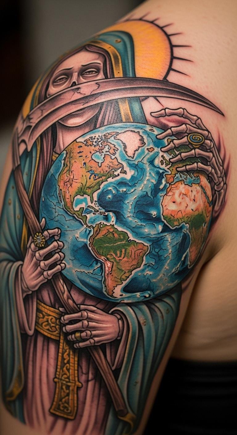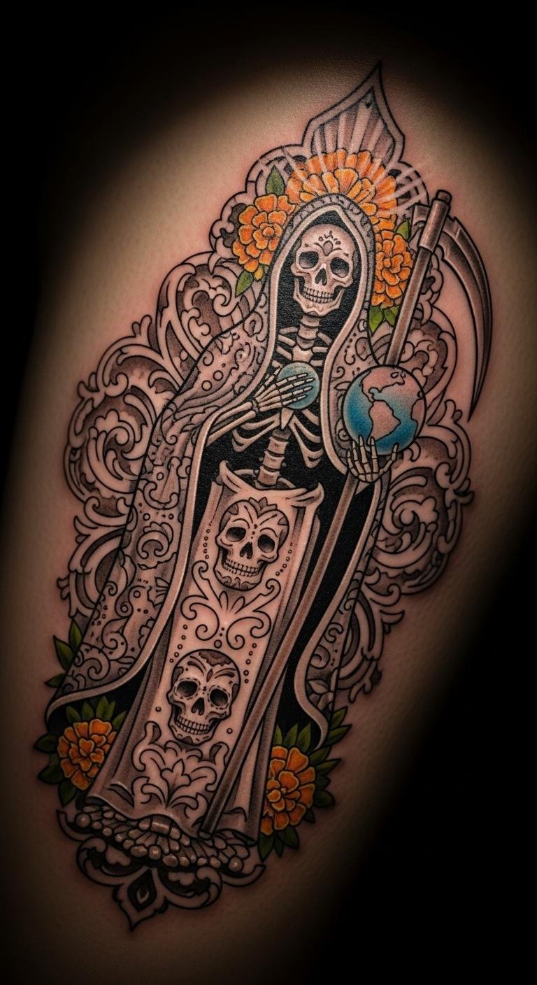The globe adds a layer of worldwide protection to Santa Muerte tattoos, showing balance and safety. Imagine it on your back as a guard against daily chaos. It ties into themes of unity and strength. Get creative with a DIY drawing using everyday paper and a pencil. Outline the globe and add simple skeletal touches. For low-cost fun, print globe stickers and trace them on your skin. They cost pennies at craft stores. Chat with a tattoo pro about basic ink to fit your budget. Combine it with other motifs for a layered look. This approach lets you build meaning step by step.