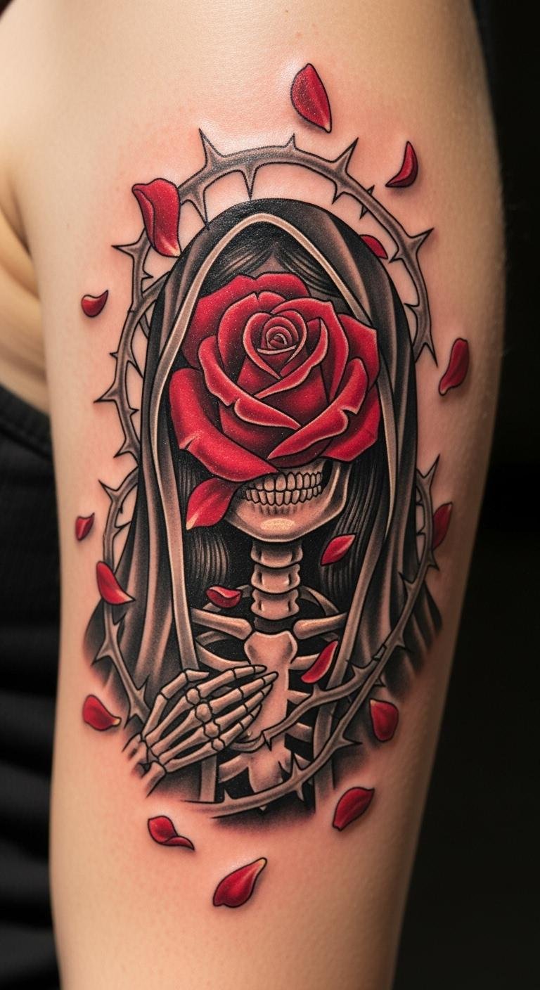 Roses personalize Santa Muerte tattoos, adding emotion and beauty. Try it on your finger for a discreet touch. This element brings warmth to the design. Draw roses with colored pens on scrap paper. Make them twist around figures. For budget ideas, use flower stickers as guides. Apply temporarily to check fit. Discuss custom additions with an artist at lower rates. This tweak makes your tattoo stand out affordably.