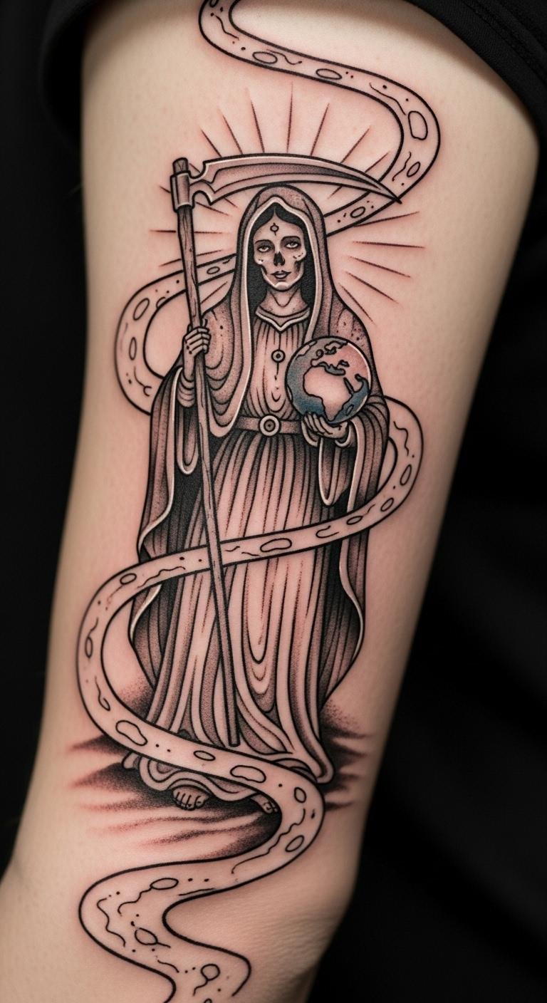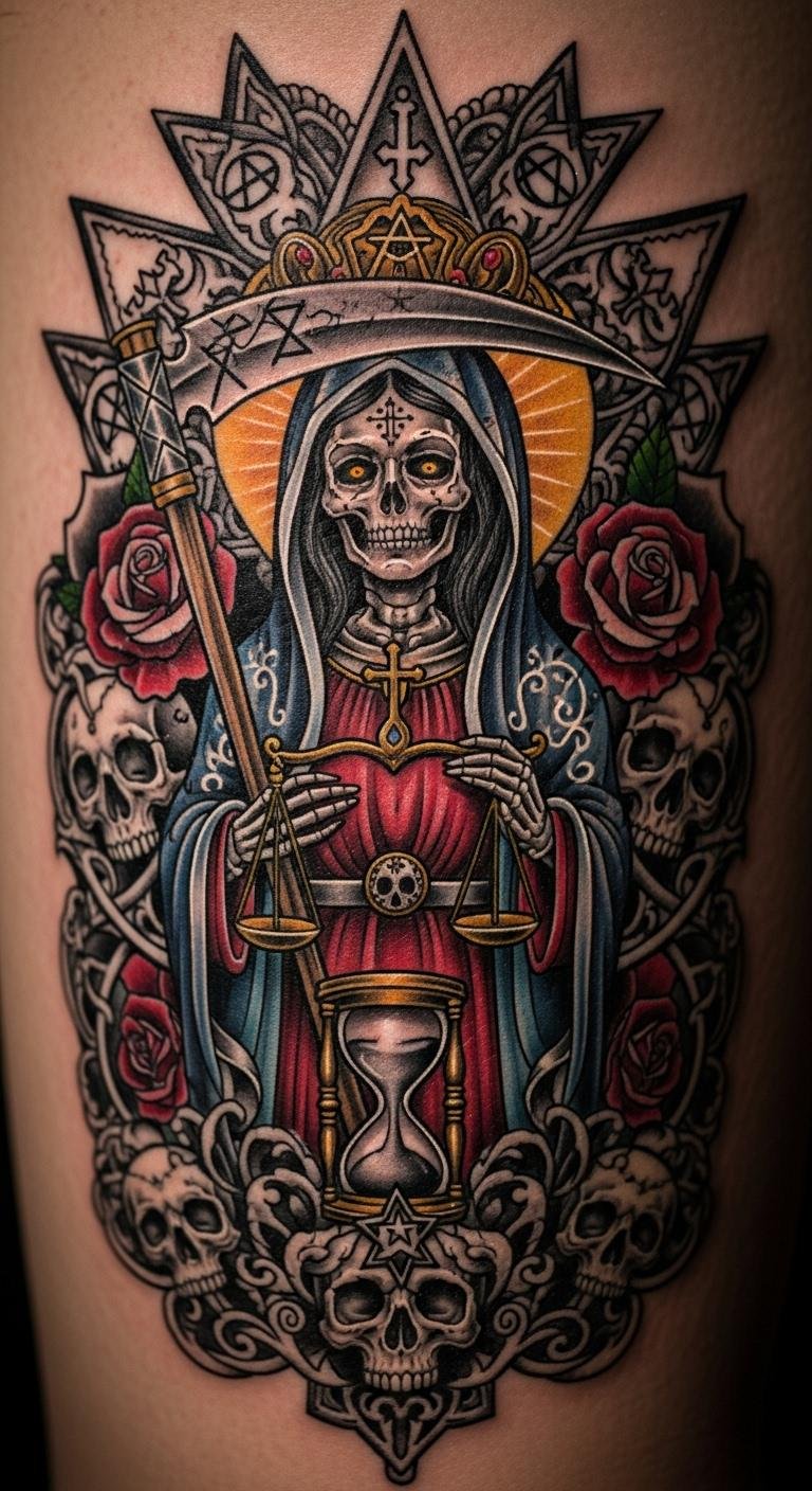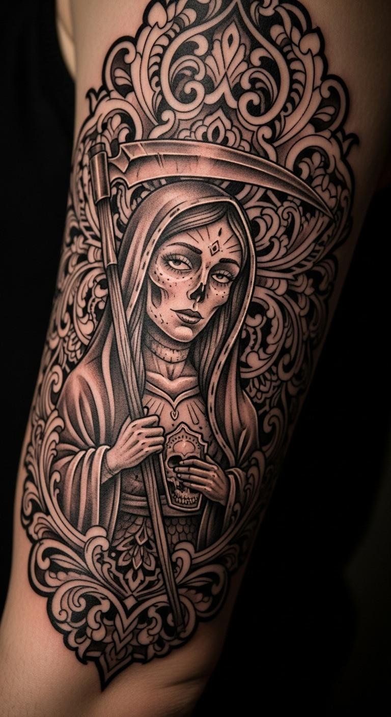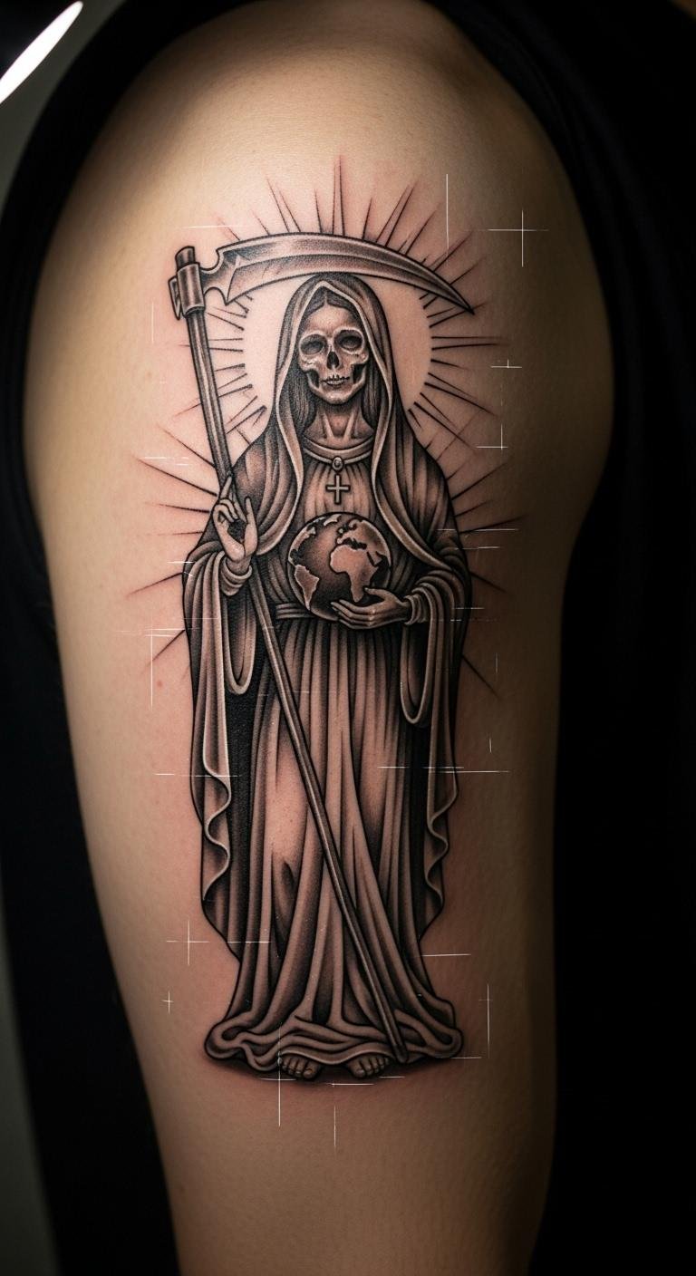 Mix old and new in Santa Muerte tattoos for a fresh take on tradition. Try it on your chest for a bold statement. This fusion adds excitement to classic symbols. Use markers at home to sketch combined shapes. Draw a skeleton with contemporary edges. Save with printable templates online at no charge. Bring your design to a shop for affordable updates. Pair elements like scythes with geometric lines. This keeps your tattoo unique and budget-smart.