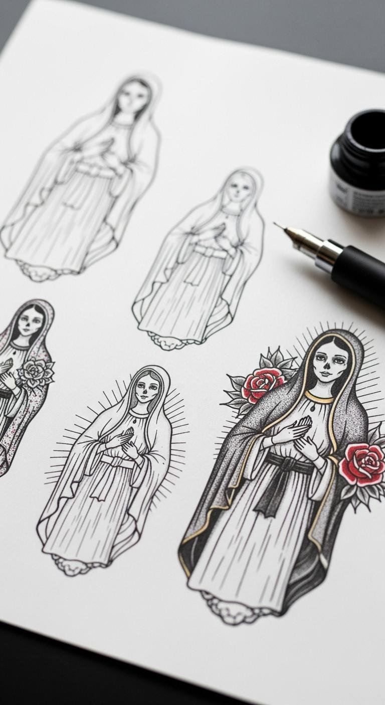 Practice DIY for Santa Muerte tattoos to get it right. Do it on paper for quick ideas. This helps refine choices. Grab pens and draw freely. Focus on key parts. Use household items for mock-ups. Review and adjust easily. Take your best to pros. This keeps things hands-on and low-cost.