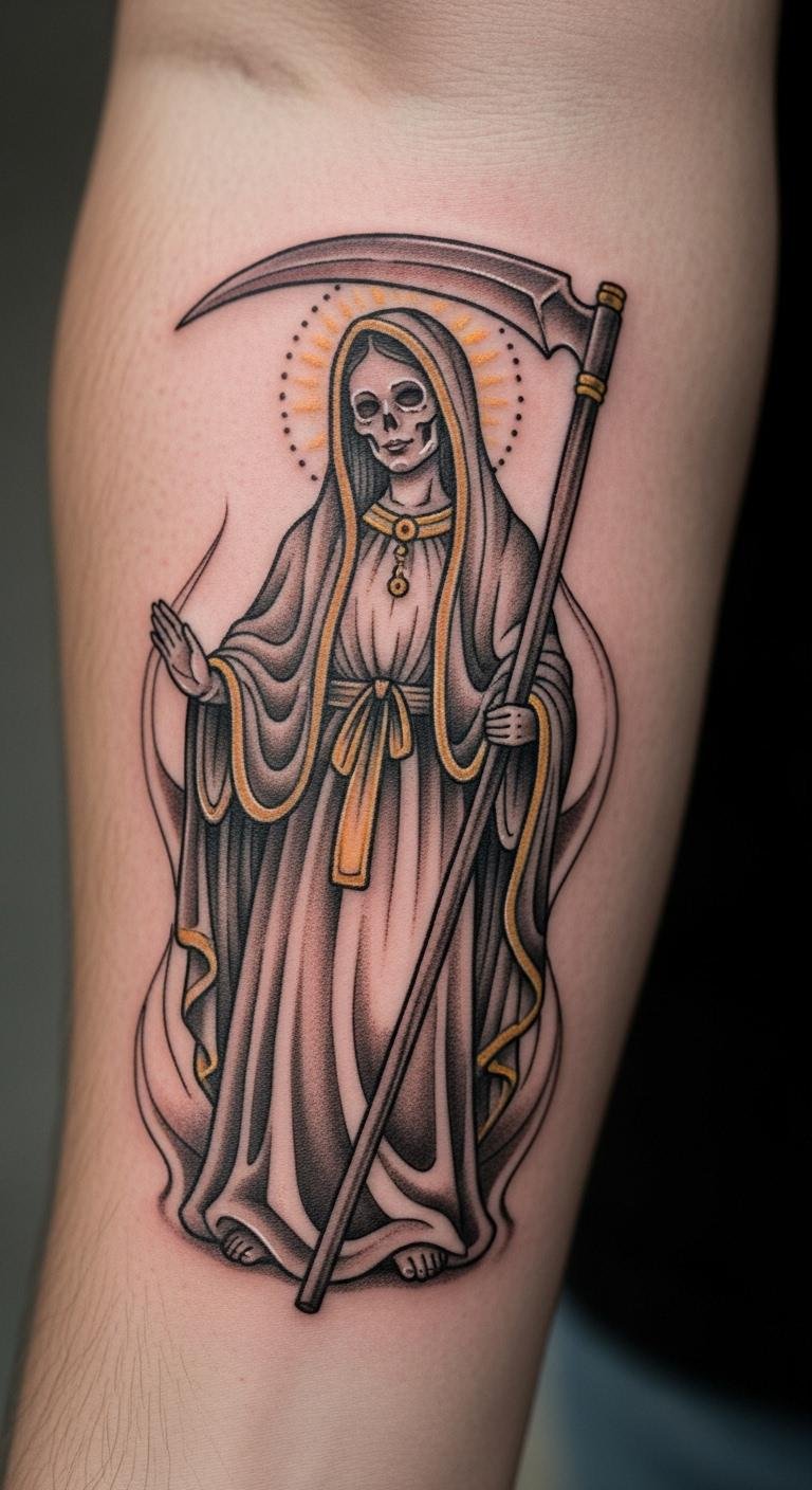 The scythe stands out in Santa Muerte tattoos as a symbol of cutting through life’s hurdles. Picture this simple yet powerful shape on your arm. It represents change and protection in one stroke. Start small with a DIY sketch using a basic pen and paper. Draw the blade with curved lines and add bone patterns for flair. For a budget pick, grab temporary tattoos online for under $10. Stick one on and test the spot. When ready, visit a local shop and ask for simple line work to keep costs down. This design fits anyone wanting a quick, meaningful addition. Mix it with other symbols like skulls for a custom vibe. Easy tweaks make it your own without much fuss.