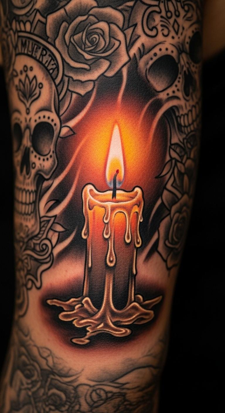 Candles in these tattoos represent light and connection to the past. Place one on your leg for a quiet nod to memories. It evokes guidance and peace in tough times. Experiment at home with wax crayons on paper. Sketch a candle flame with soft edges. Save money by using free apps to design on your phone. Show the idea to a local tattooist for budget-friendly tweaks. Blend it with family symbols for depth. This way, you create something meaningful on a shoestring.