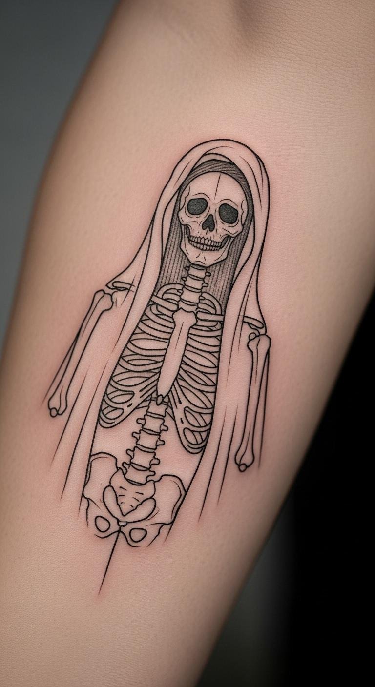 Go simple with a skeleton outline in Santa Muerte tattoos for a clean, modern feel. Put it on your ankle for subtle strength. This style focuses on core ideas without clutter. Draw it yourself on notebook paper with a fine-tip pen. Keep lines straight and basic. For cheap trials, get stick-on versions from dollar stores. Test spots before committing. Find an artist who does quick line work to cut costs. Add a small detail like a heart for personalization. It’s an easy way to start your ink journey.