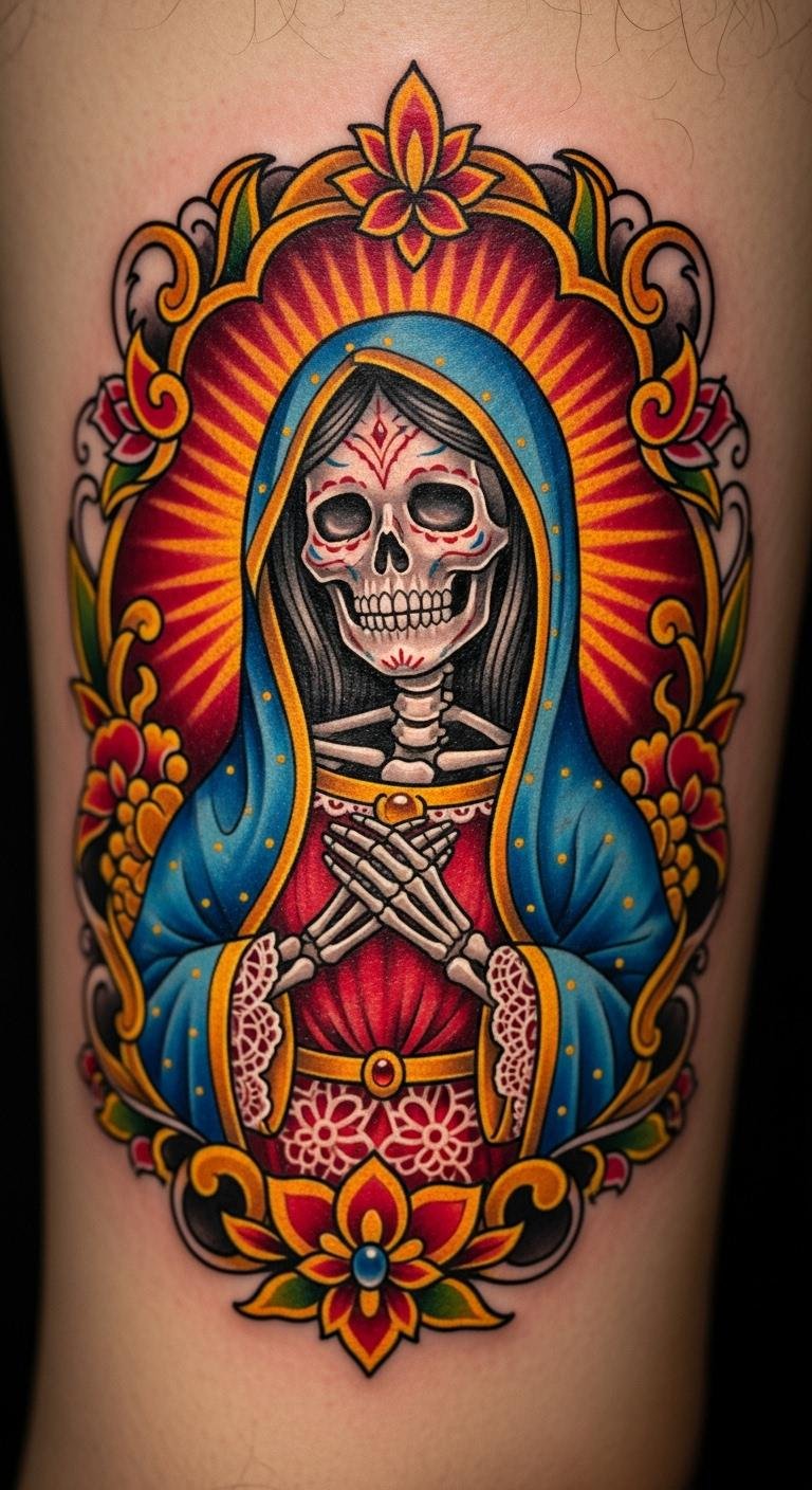 Blend styles for modern Santa Muerte tattoos that feel current. Try it on your back for a full expression. This mix sparks creativity. Sketch hybrids at home with mixed tools. Combine shapes freely. Practice with scrap materials for free. Show ideas to artists for cost-effective work. Add modern twists for fun. Keep it engaging and personal.