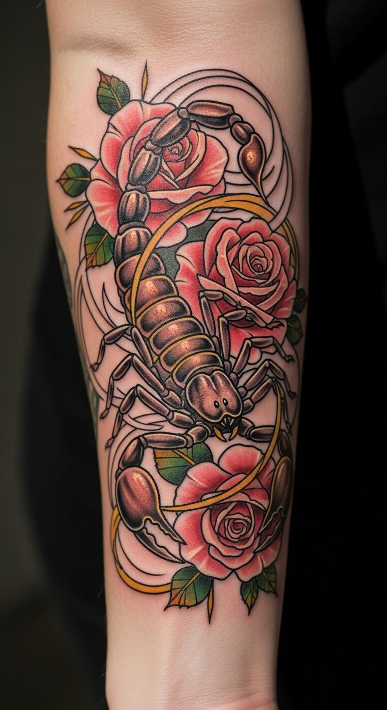Blend a scorpion with roses for a touch of beauty. This mix adds depth to your ink. Start by drawing roses around a scorpion sketch at home. Use affordable markers for practice—under $5. Put it on your arm for daily visibility. Bold the key: pair symbols smartly. A DIY hack: trace rose images online and adapt them. This keeps costs low while making it personal. It’s a simple way to highlight your passionate side.