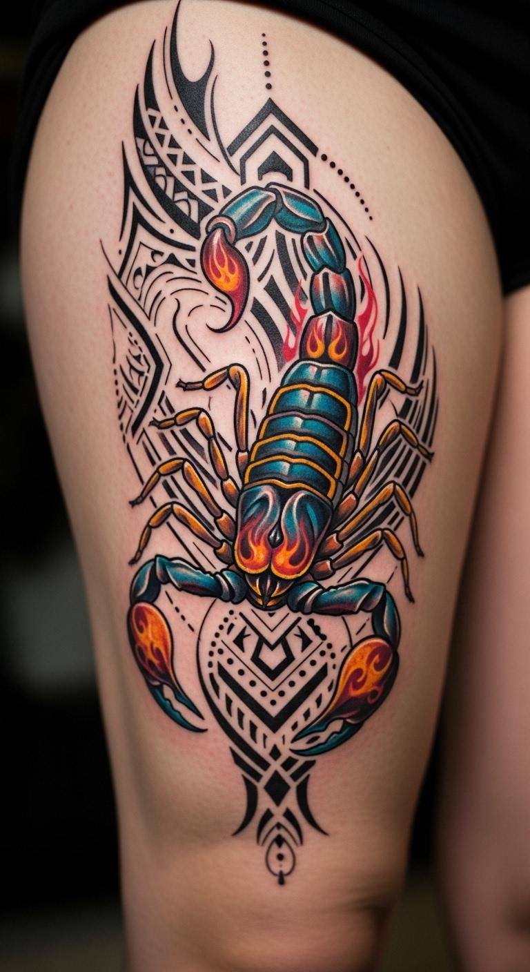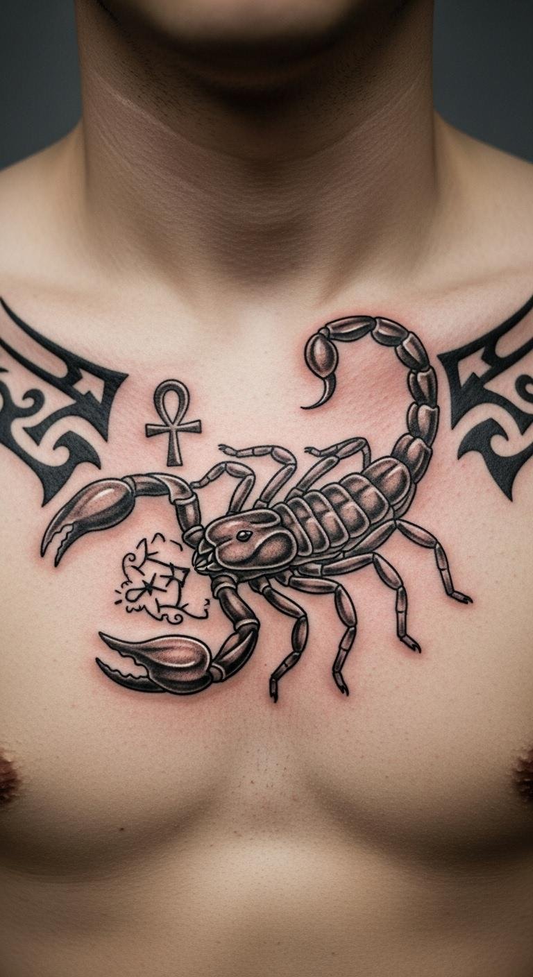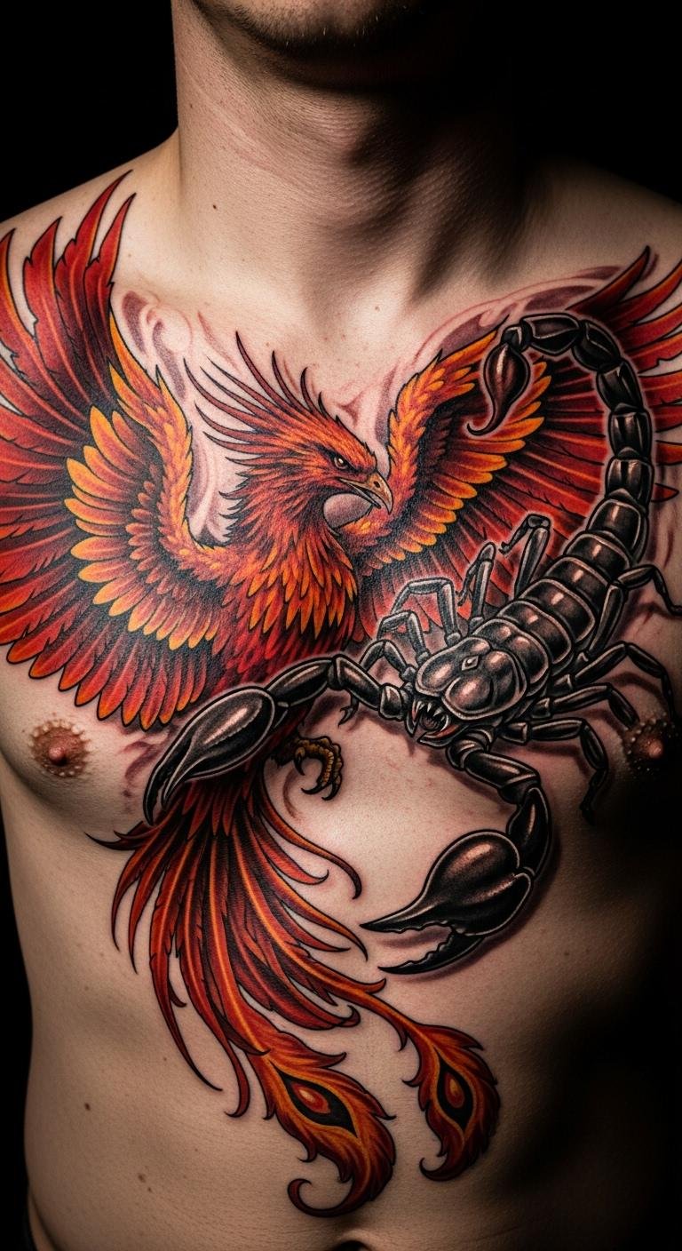 A phoenix with your scorpion means renewal. Draw a bird shape at home first. Use colored pencils for fun—under $10 total. Place it on your chest for impact. Bold the key: mix rebirth themes. Try a DIY template from free sites. This saves money on custom work. It’s an affordable path to personal growth ink.