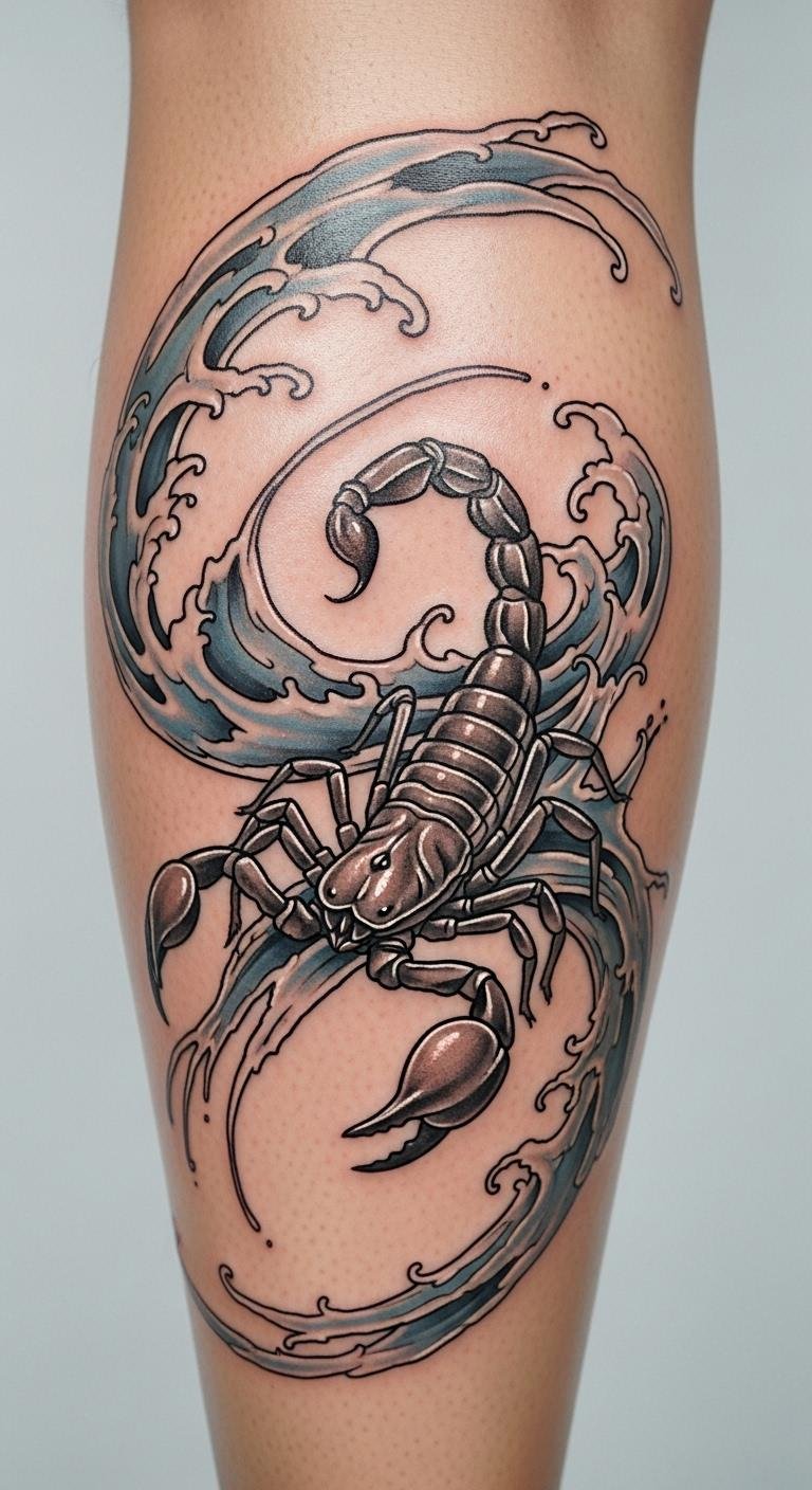 Waves around a scorpion show change. Sketch waves freehand on paper to start. Use water-based pens for a test—low cost at $2. Opt for your leg to keep it private. Bold the key: add flow elements. A simple DIY: watch online tutorials on wave drawing. This helps you visualize without spending much. It’s a straightforward way to reflect Scorpio’s depth.