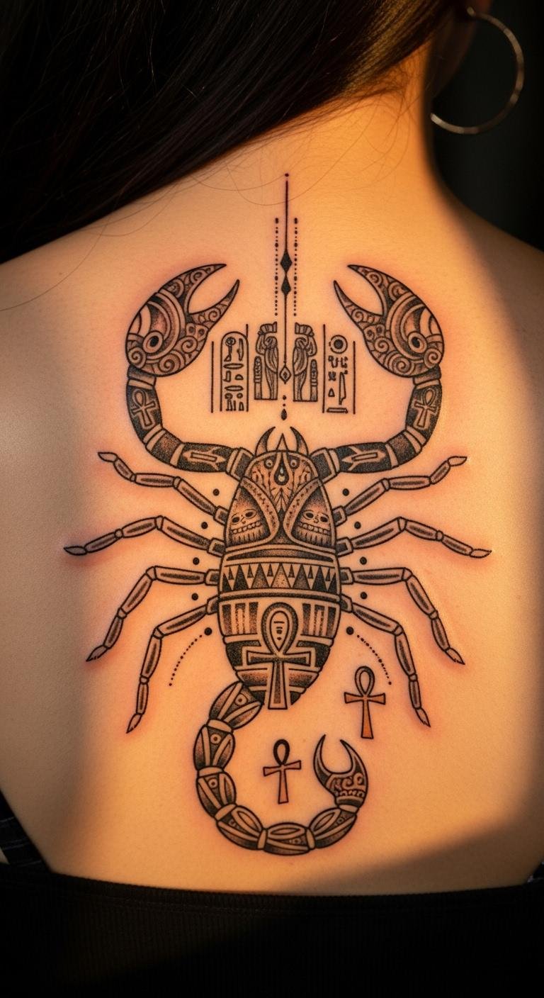 Egyptian-style scorpion tattoos use old motifs. Research symbols and copy them. Find free history images. DIY: etch on clay at home. Place on your back for scale. It ties to history. Costs $80–$160. Adapt simply.