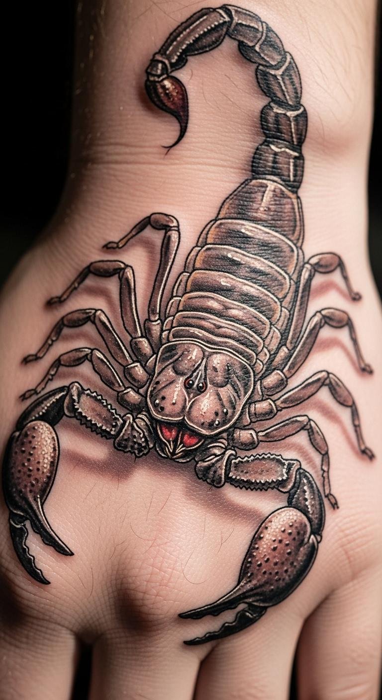 Hyper-realistic scorpion tattoos look alive. Photo real bugs for reference. Contact detail artists. DIY: paint replicas on paper. Put on your hand for impact. It captures nature. Costs $100–$200. Build up slowly.