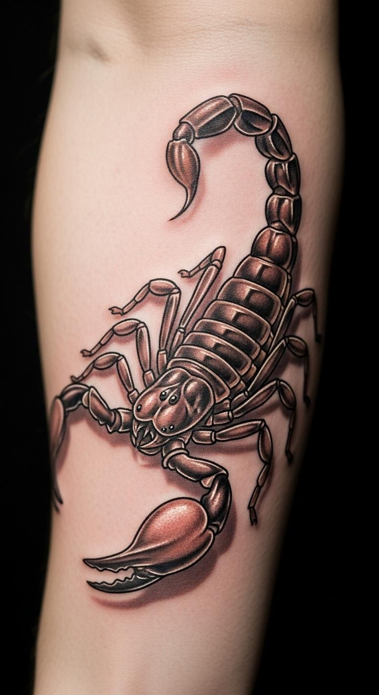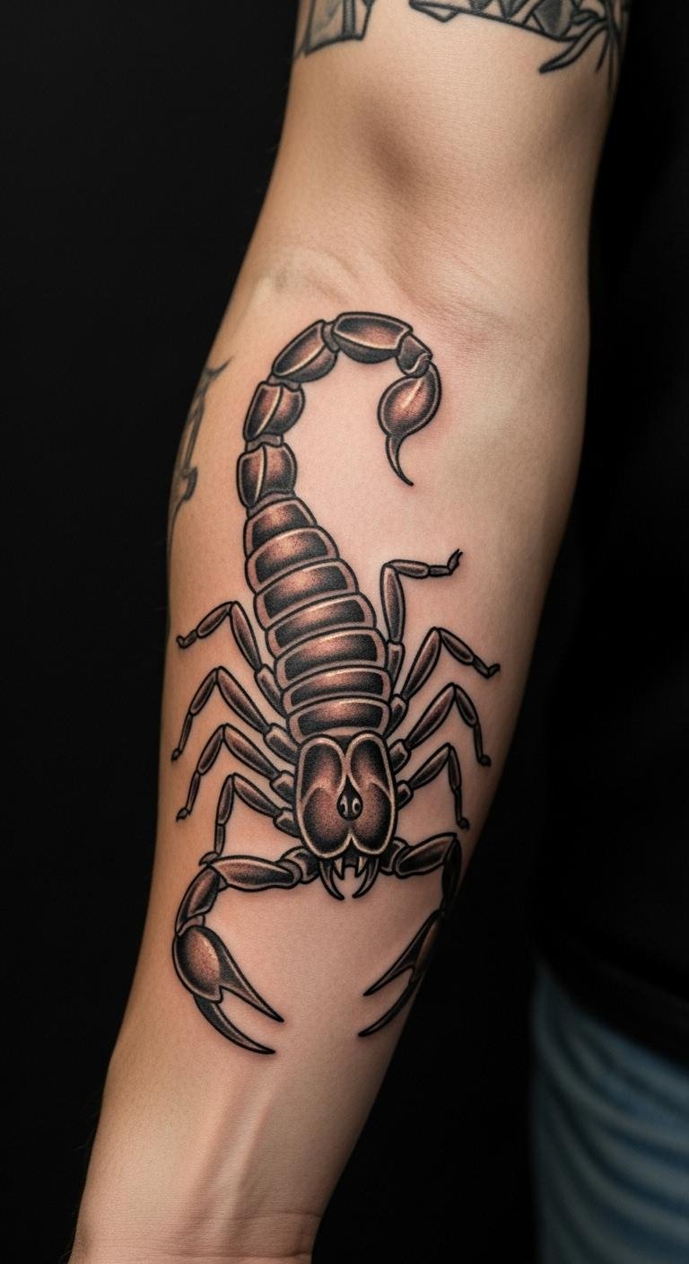 Forearm scorpion tattoos show off easily. Draw templates on your arm with washable ink. Choose artists from local shops. Try paper cutouts for placement ideas at no cost. It stands for resilience here. Keep designs medium for quick sessions, $60–$130. Add wraps if you work in offices.