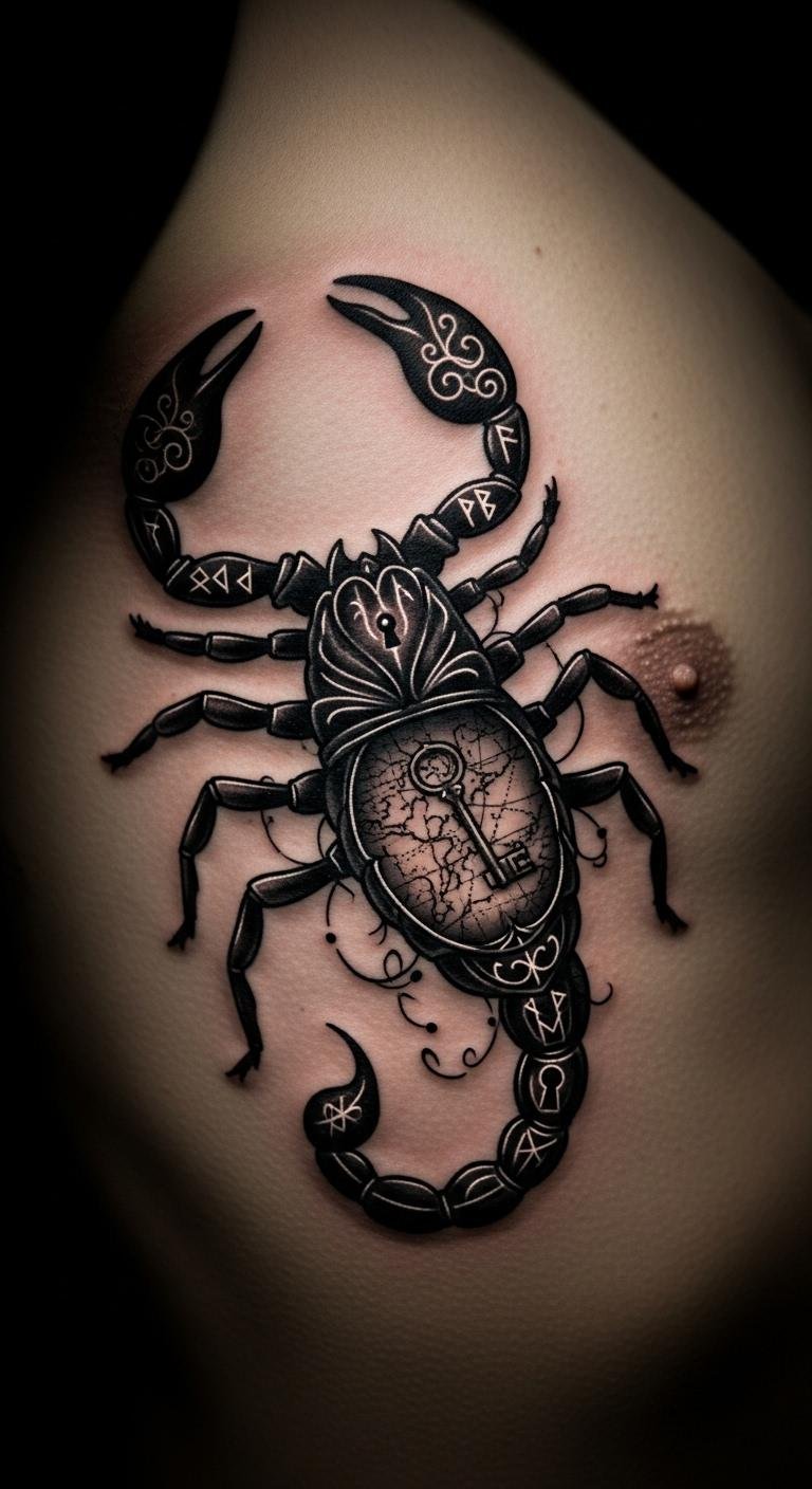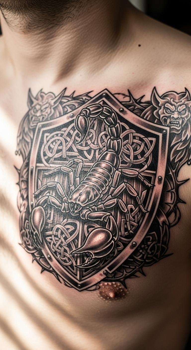 Protective scorpion tattoos ward off vibes. Include shield elements in designs. Share with friends for input. Free: carve protective symbols. Spot on chest for heart. It guards personal space. Prices $60–$130. Seal it in.