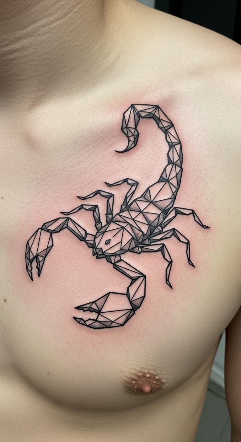 Geometric scorpion tattoos build the creature from shapes and angles. Sketch grids on paper to plan yours. Use free design software to play around. DIY idea: make a stencil with household tape for temporary tries. Spot it on your shoulder for balance. This design shows strength through form. Go for simple black to keep prices at $60–$120. Layer in extra patterns for fun.