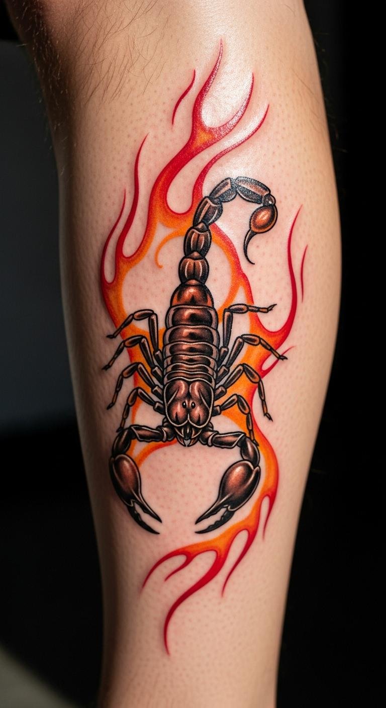 Scorpion with flames tattoos add heat effects. Sketch fire patterns around a scorpion shape. Use phone apps for free edits. DIY: paint on fabric to test. Spot it on your calf for action. It means passion clearly. Go for red shades to save, $70–$140. Layer carefully.