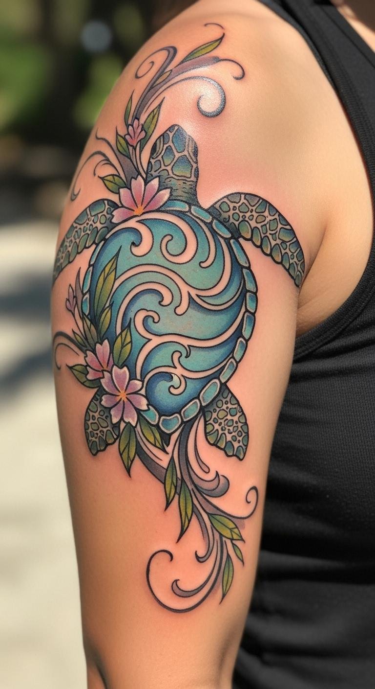 Nature-inspired sea turtle tattoos blend turtles with elements like flowers or waves. Imagine a design where coral frames the turtle for a unified look. These combos add depth to your ink. Search free stock sites for ideas you can adapt. Find a budget artist through social media—custom add-ons might only add $20-30. Create your own version by drawing waves on paper with markers you already own. Bold the floral parts to make them pop. Opt for spots like the shoulder for balanced flow. Book in advance to catch deals. Care for it using household aloe vera gel. This style connects you to the environment affordably and creatively.