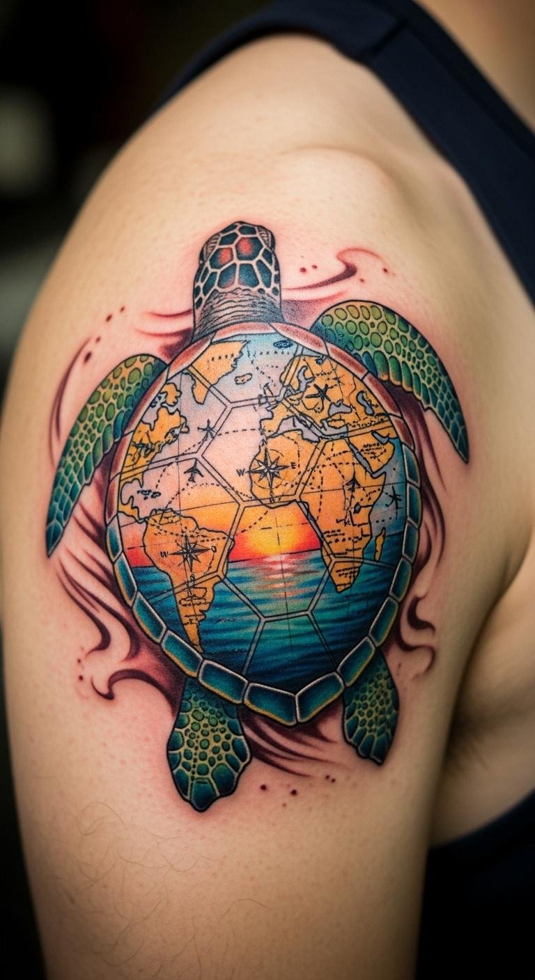 Travel-inspired sea turtle tattoos include waves or maps for adventure. They capture journeys. Mix in travel motifs. Find ideas from trip sites. Pick a worldly artist. Draw your route. Bold the elements. Place on travel spots. Book for trips. Care on the go. This celebrates exploration.
