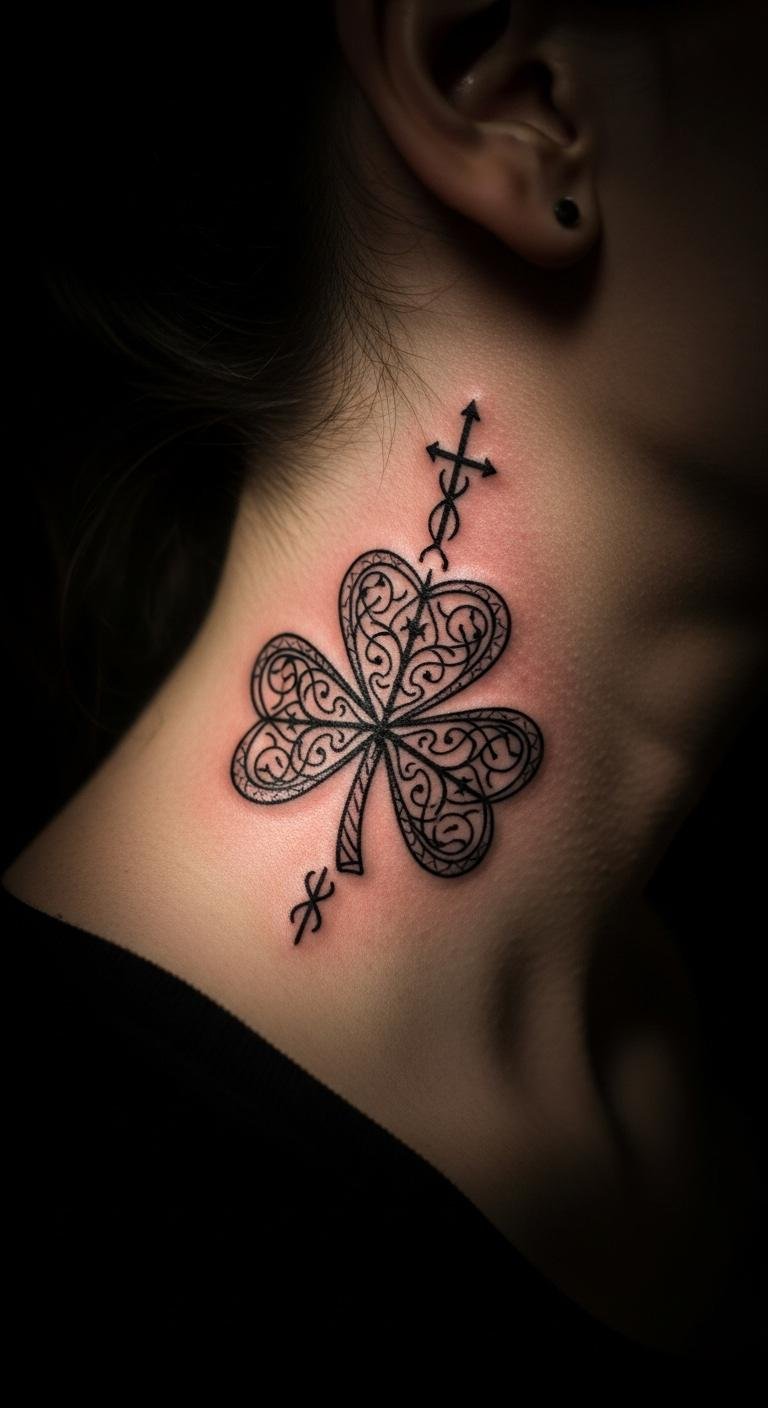 A shamrock for faith echoes old tales. It’s about belief in ink. Neck placement adds significance. Find faith-themed artists. Draw it with faith symbols. Keep it symbolic . Short session works. Protect with scarves. Add faith items. Draft on paper. This design inspires. Carry it close.