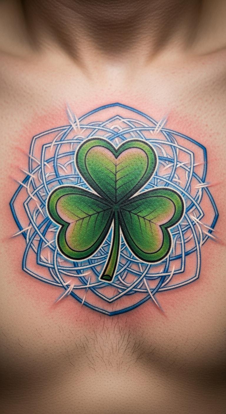 A protective shamrock guards you. It’s like armor in ink. Chest holds power. Seek protective options. Draw shields around it. Use strong lines . Get it done. Cover carefully. Add protective gear. Practice drawing. This one defends. Wear it boldly.
