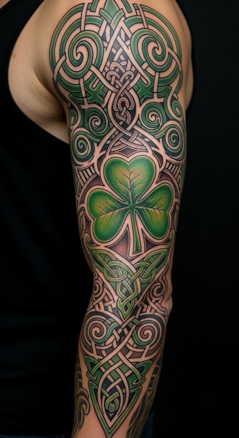 Build a detailed Celtic shamrock sleeve for full coverage. It tells a big story. Arm sleeve is ideal. Save for pieces. Sketch patterns step by step. Layer details gradually . Multiple visits. Care section by section. Match with Celtic wear. Plan drawings. This one immerses. Show it fully.