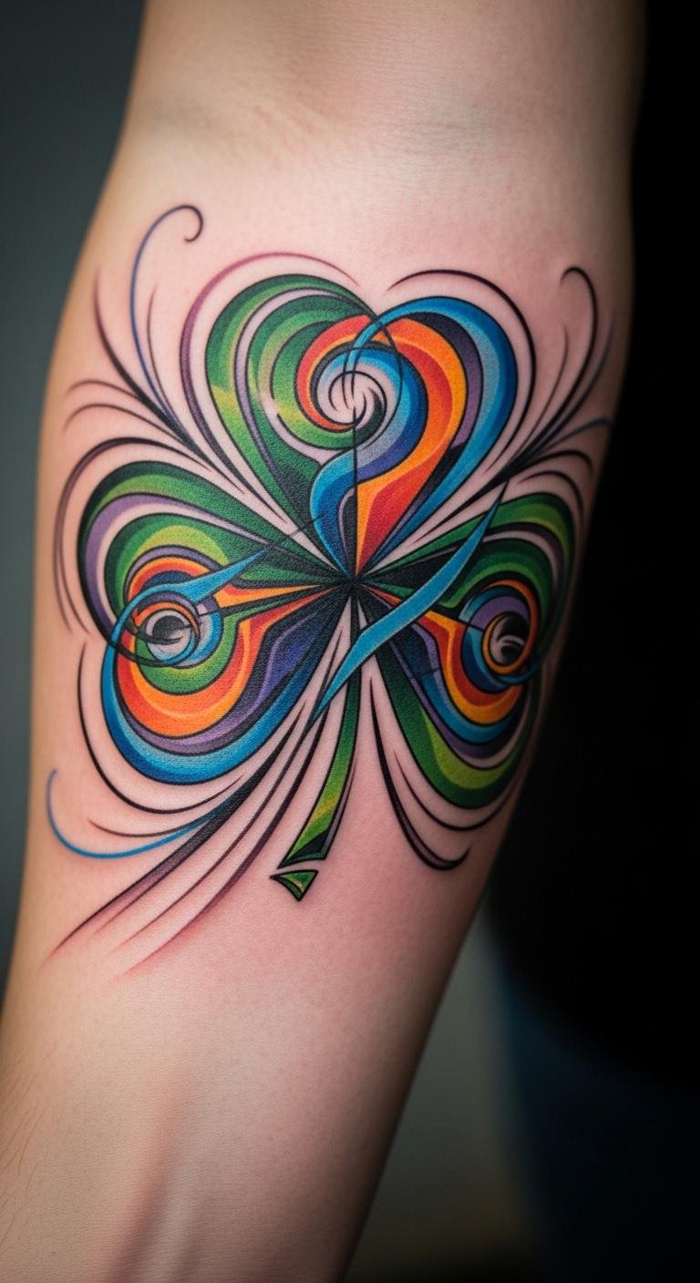 Go abstract with a shamrock for unique flair. Shapes twist and turn creatively. Put it on your arm for visibility. Find artists with portfolio deals. Create swirls on paper with crayons. Mix shapes simply to cut costs. Book a flexible time. Heal with natural oils. Layer with abstract clothes. Test on draft paper. This design sparks talks. Wear it proudly.