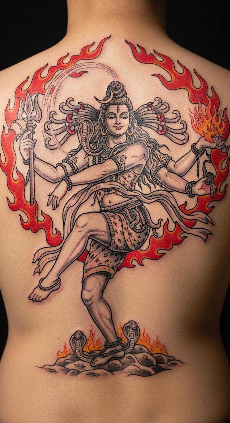 Encircle Shiva’s head with flames for intensity. Upper back placement feels protective. It burns away doubts. Draw flame shapes with colored pencils at home. Online fire effect tools enhance ideas. Keep it to basic flames for $70 savings. Add personal flames from your drawings. Browse free art sites for boosts. This DIY route is practical. Use back patches to preview. Bold the head center stage. It ignites your spirit.