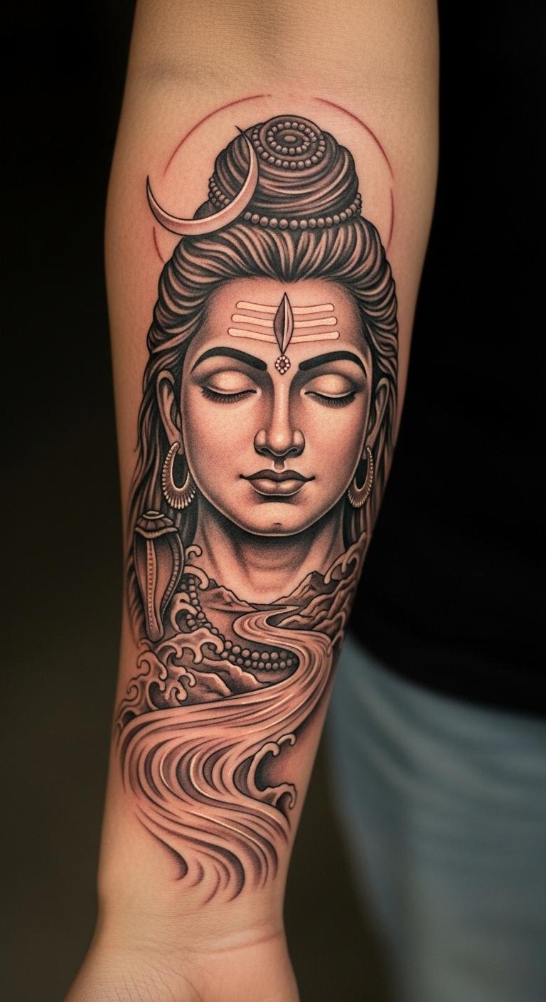 A crescent moon with river flow honors Shiva’s calm nature. Place it on your forearm for visibility. It flows like life’s journeys. Practice drawing rivers with free art apps on your phone. Keep designs basic to stay under $70. Add moons that reflect your mood from quick sketches. Use public domain images for inspiration. This method keeps costs down and ideas fresh. Stick on a fake version to see how it sits. Bold curves make it lively. It’s a simple way to connect with nature.