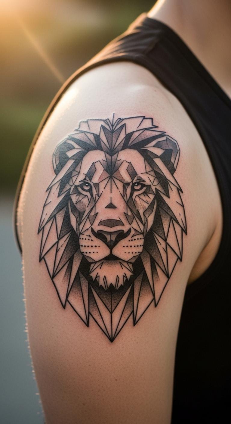 Picture a geometric lion on your shoulder—bold angles and clean lines create a modern edge. This design symbolizes courage and leadership. Start simple. Choose a basic sketch online. Add your twist, like stars for extra flair. For a budget option, draw it on paper with a marker first. Test placement using a temporary tattoo kit from the dollar store. Mix styles by combining geometric with realistic eyes. Keep it personal. Think about what the lion means to you. This tattoo fits well on the shoulder for easy hiding at work. Go to a local artist who offers affordable sessions. They might have templates you can modify cheaply. Aim for black ink to keep costs down. End result? A confident look that turns heads.