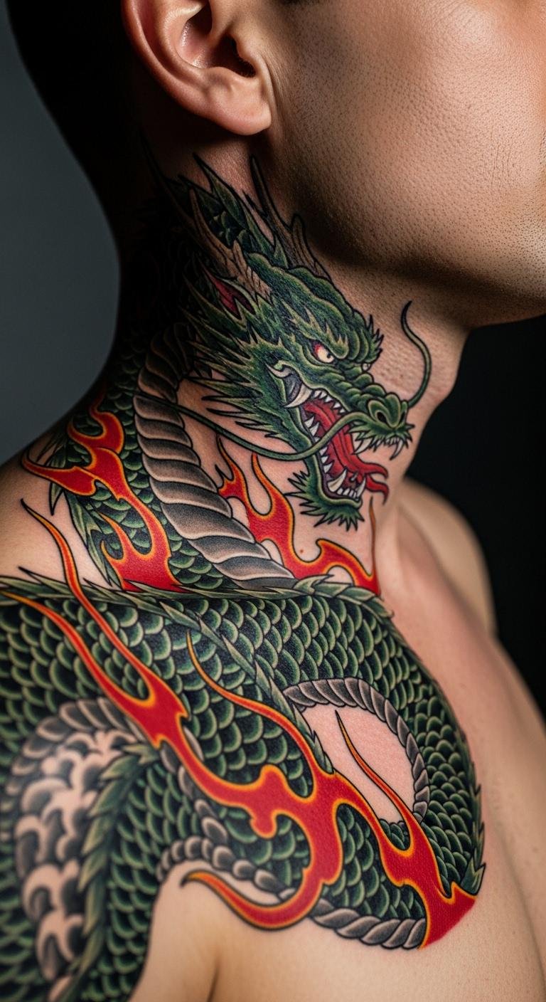 Stretch a dragon from neck to shoulder for epic scale and power. It embodies protection and strength. Choose a streamlined dragon. Add flames for intensity. Outline it with basic tools. Apply a fake version affordably. Pair with geometric scales. Position for maximum impact. Look for package deals. Opt for outline to economize. This design exudes confidence. Tailor it to your myth.