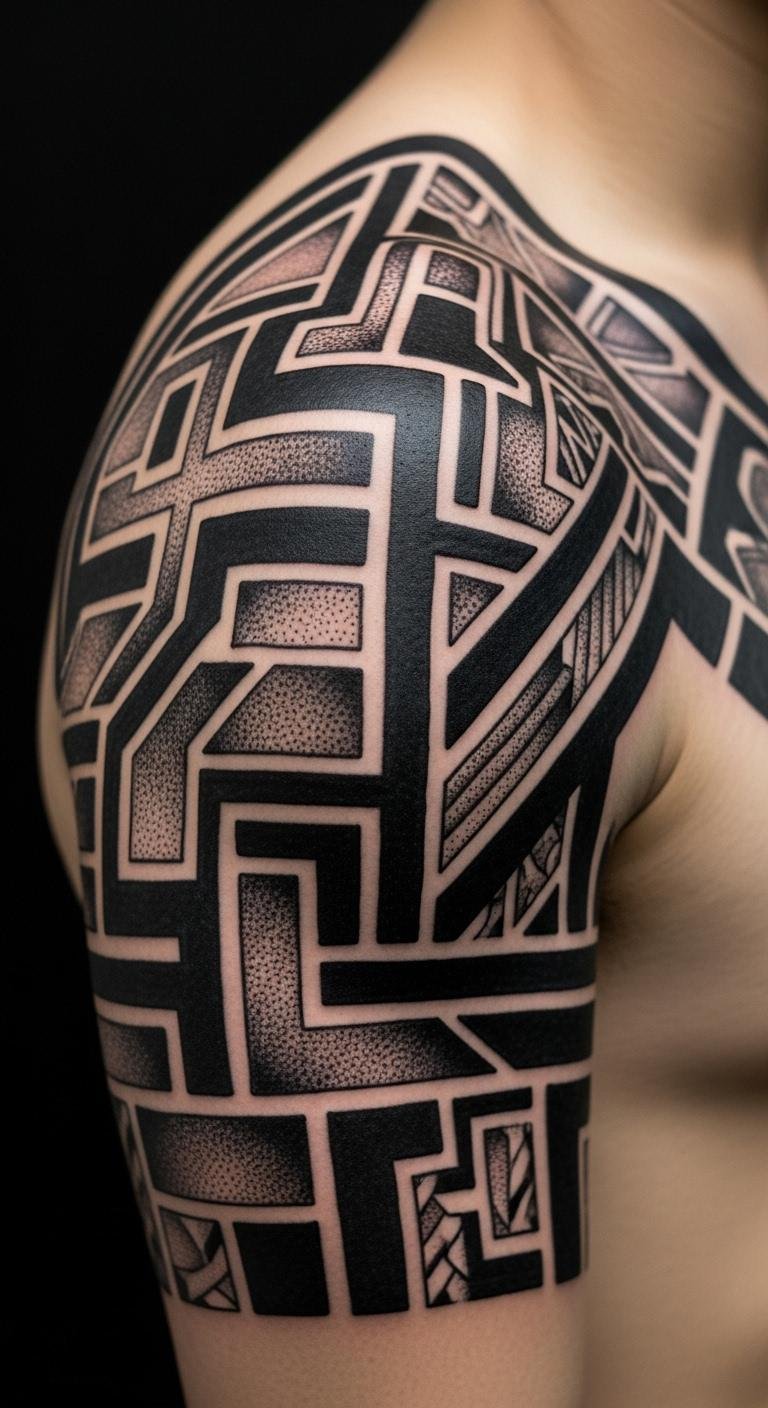 Go solid with blackwork patterns on your shoulder for striking simplicity. It delivers clean impact. Select block designs. Add edges for definition. Draw blocks at home. Use affordable stamps. Mix with realism. Place for bold effect. Look for walk-in deals. Keep it pure black. This tattoo commands attention. Build it layer by layer.