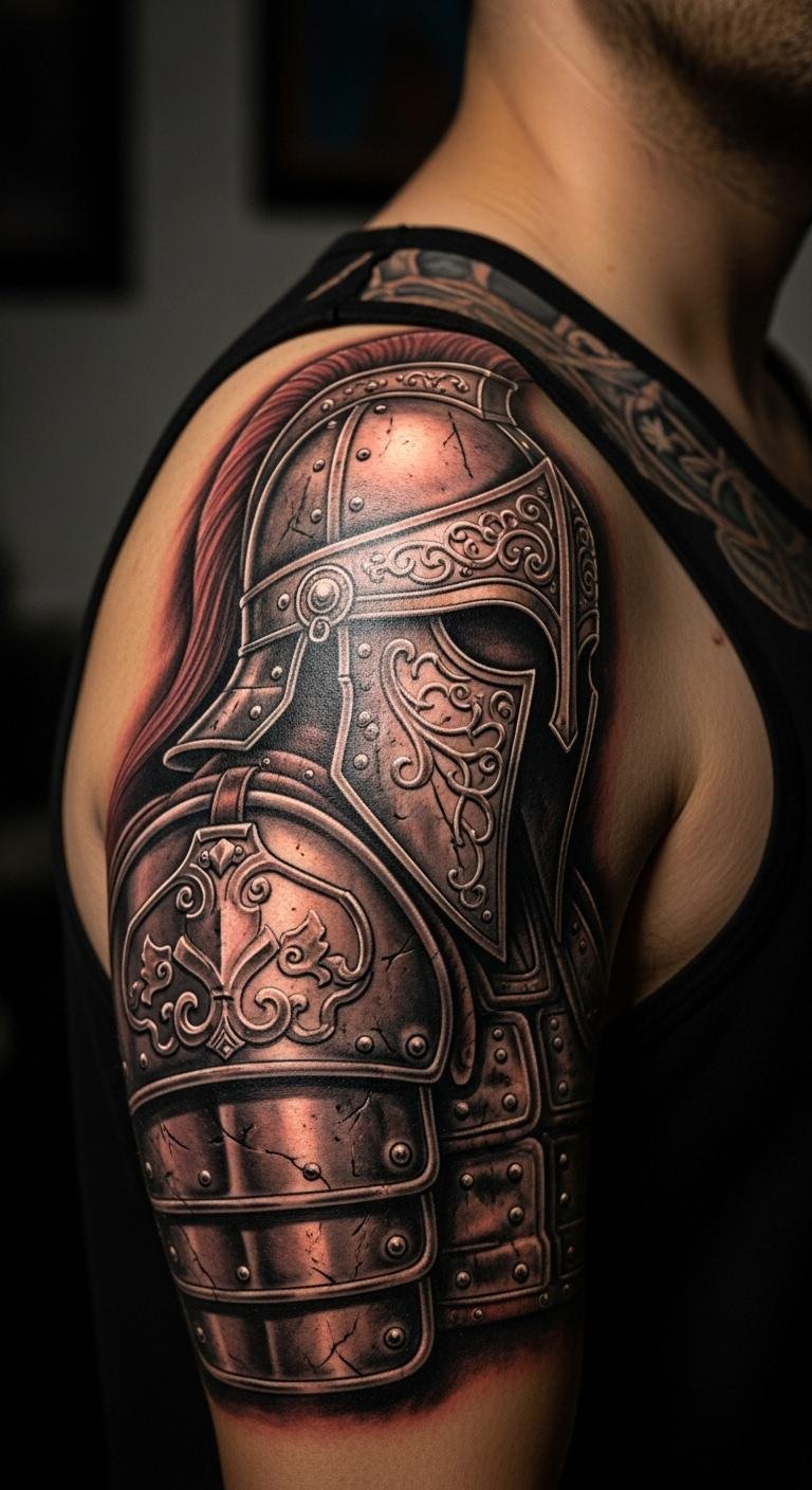 Wear a warrior helmet on your shoulder for courage and history. Pick a helmet outline. Add weapons. Sketch it simply. Use budget prints. Mix with myths. Site it proudly. Find history-themed artists. Go with basics. This tattoo empowers you. Build your legend.