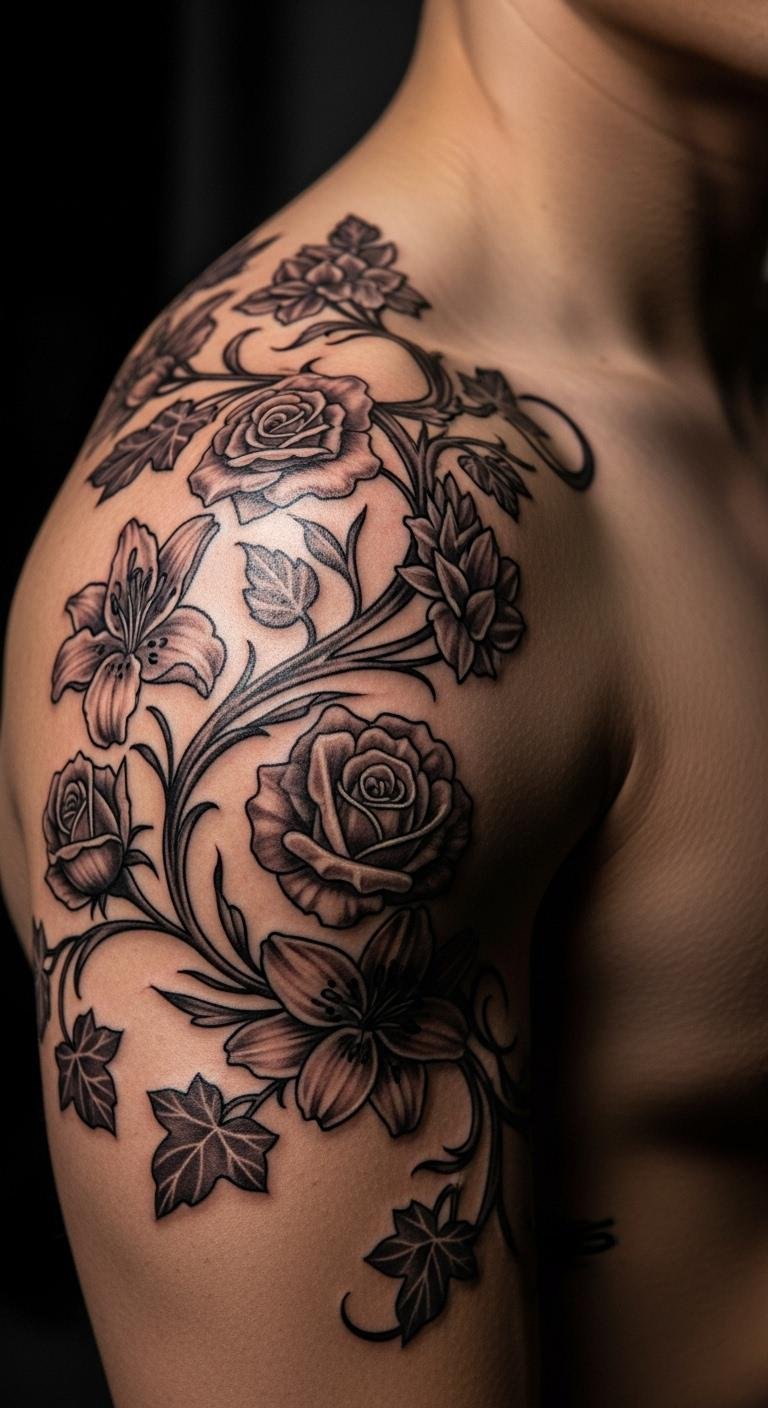 Wrap your shoulder in floral vines for growth and beauty. Choose flowing vines. Add blooms. Draw vines at home. Test with leaves. Blend with patterns. Position for wrap. Seek garden-inspired deals. Use light shades. This tattoo blooms confidence. Adapt to your garden.