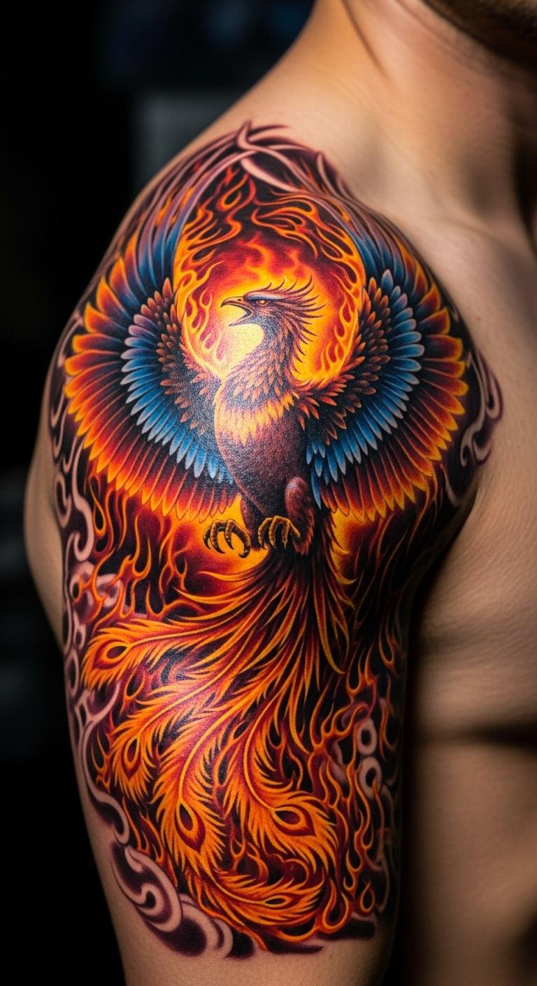 Rise like a phoenix on your shoulder for renewal and fire. Choose a rising pose. Add flames. Draw it dynamically. Try fire effects. Mix with symbols. Site it rising. Find rebirth themes. Use bold colors. This tattoo ignites strength. Personalize your rise.