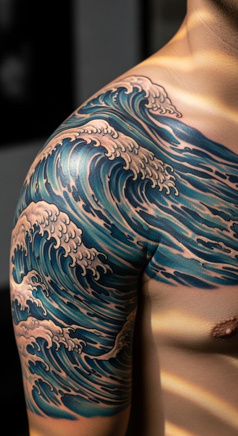 Crash waves on your shoulder for freedom and depth. Select wave flows. Add sea life. Draw waves freely. Test with water. Fuse with sunflowers. Place for motion. Look for ocean deals. Use flowing lines. This tattoo surges energy. Adapt to your seas.