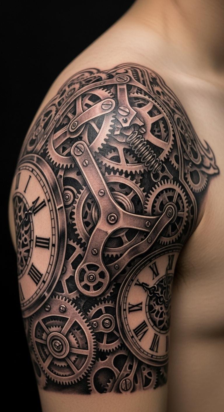 A clock with gears ticks on your shoulder, marking time and growth. It shows life’s journey clearly. Choose a classic face design. Add gears that represent milestones. Sketch it quickly on paper at home. Use cheap tattoo transfer paper for a test. Combine with floral elements for balance. Place it center for symmetry. Seek out sales at local studios. Go with basic lines to save money. This design helps you embrace change. Tailor it to your experiences simply.