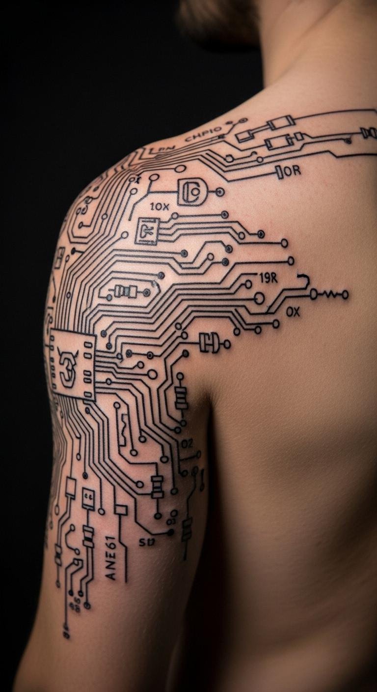 Go digital with circuit patterns on your shoulder—it’s tech-inspired and forward-thinking. Represent innovation and connectivity. Select basic circuit lines. Add nodes for personal tech. Design it via free software at home. Print and trace for a budget try. Mix with animal motifs for fun. Place it strategically for tech pros. Look for online promo codes. Keep it simple black for economy. This tattoo aligns with modern life. Adjust elements to your gadgets.