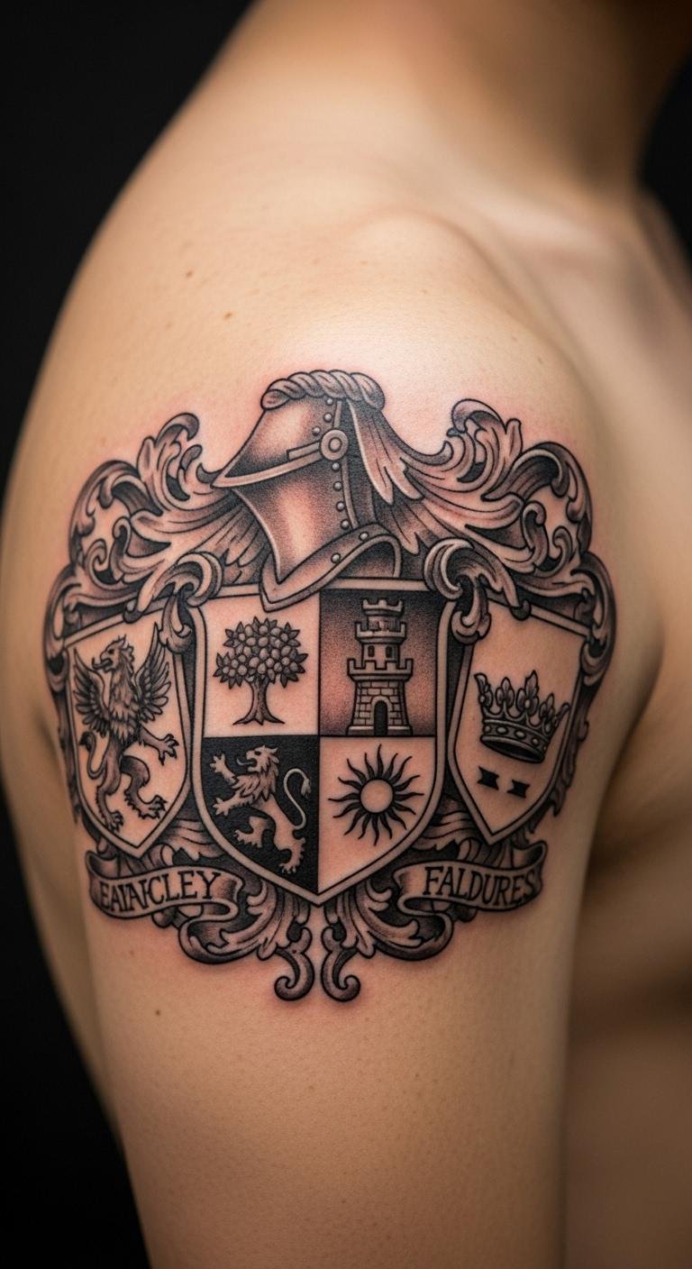 Honor your roots with a family crest on your shoulder—it’s about legacy and pride. Choose key family symbols. Add borders for emphasis. Draw it from old photos cheaply. Use temporary kits for testing. Blend with cultural patterns. Position it prominently yet coverable. Visit community centers for deals. Stick to essentials for affordability. This design strengthens family ties. Make it unique with your touches.