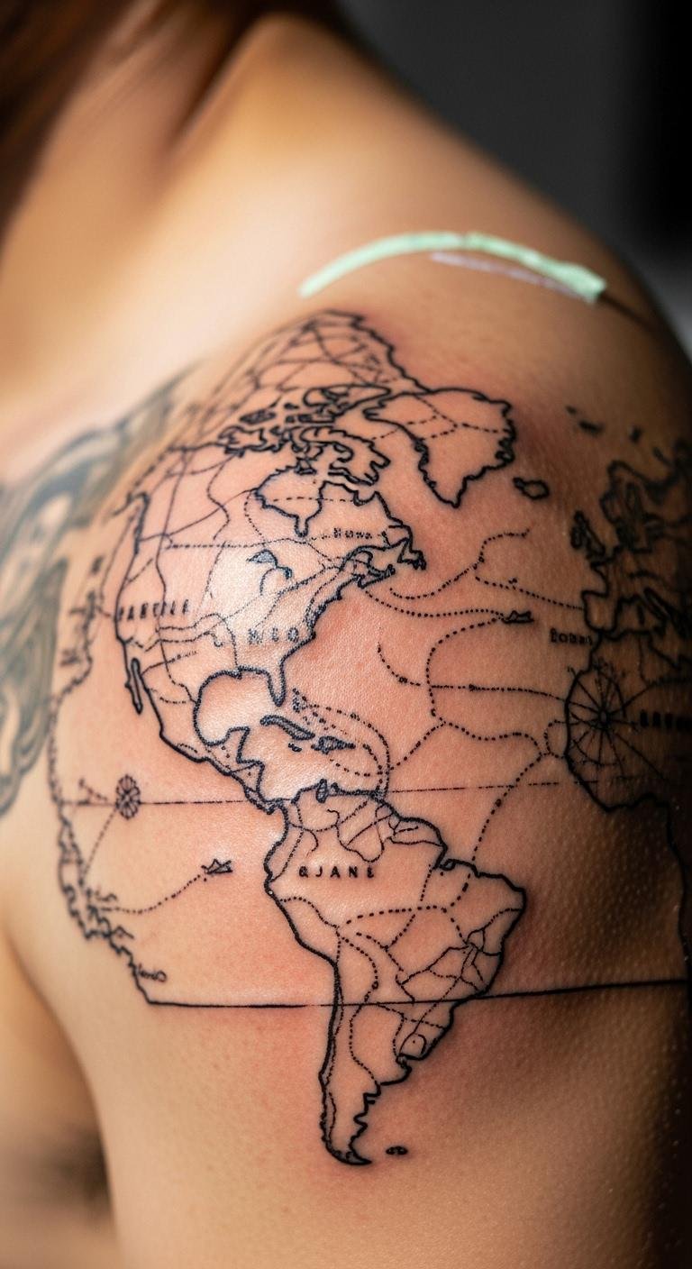 Map your journeys on your shoulder with continents and routes. It captures exploration and memories. Pick favorite spots to include. Add compass points for direction. Map it out on paper first. Use free apps for digital previews. Combine with nature elements. Place it for easy viewing. Search for budget tattoo packages. Go with line art to save. This tattoo keeps your stories alive. Personalize with real trip marks.