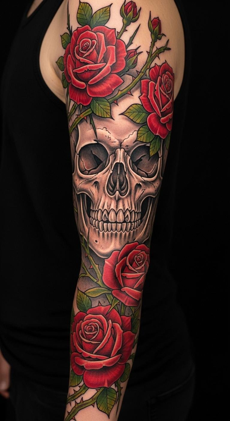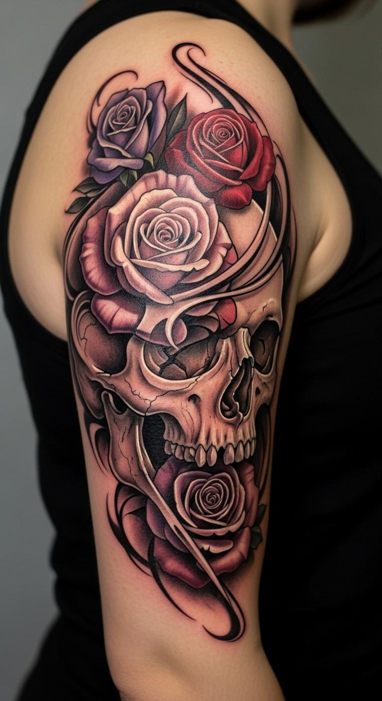 A rose wrapped around a skull makes a strong statement. This design puts life and death side by side. Start with a sketch on paper to see how it flows. Pick an affordable artist from local shops. Use free apps to draw your version at home. Add personal touches like thorn details for edge. Keep colors simple with black ink to cut costs. Get a small test tattoo first. This way, you try the idea without big spend. Flowers add a soft feel to the skull’s grit. Mix in green leaves for balance. Place it on your arm for easy show. Clean the spot daily after inking to keep it fresh.