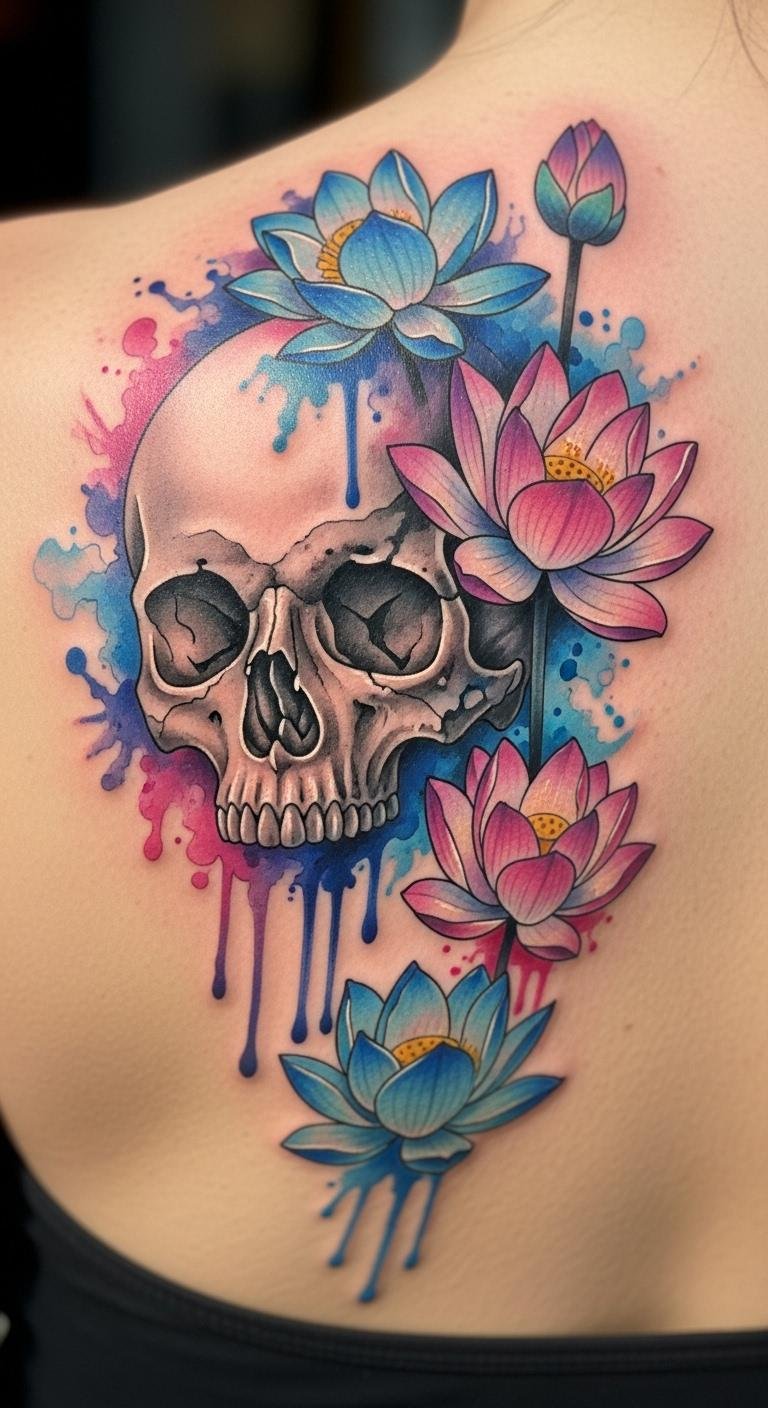 A lotus flower over a skull brings calm vibes. The soft edges mimic water’s flow. Draw this at home with markers on paper. Find cheap templates online to guide you. Choose water-based inks for a fade look. This saves on pricey sessions. Add the flower to cover old marks. Place it on your shoulder for hide and show. Use home creams to soothe skin post-tattoo. Keep the design simple to lower costs. Petals represent growth next to the skull’s end. Try a buddy session at a budget studio. This makes the process fun and easy. Focus on one color to keep it straightforward.